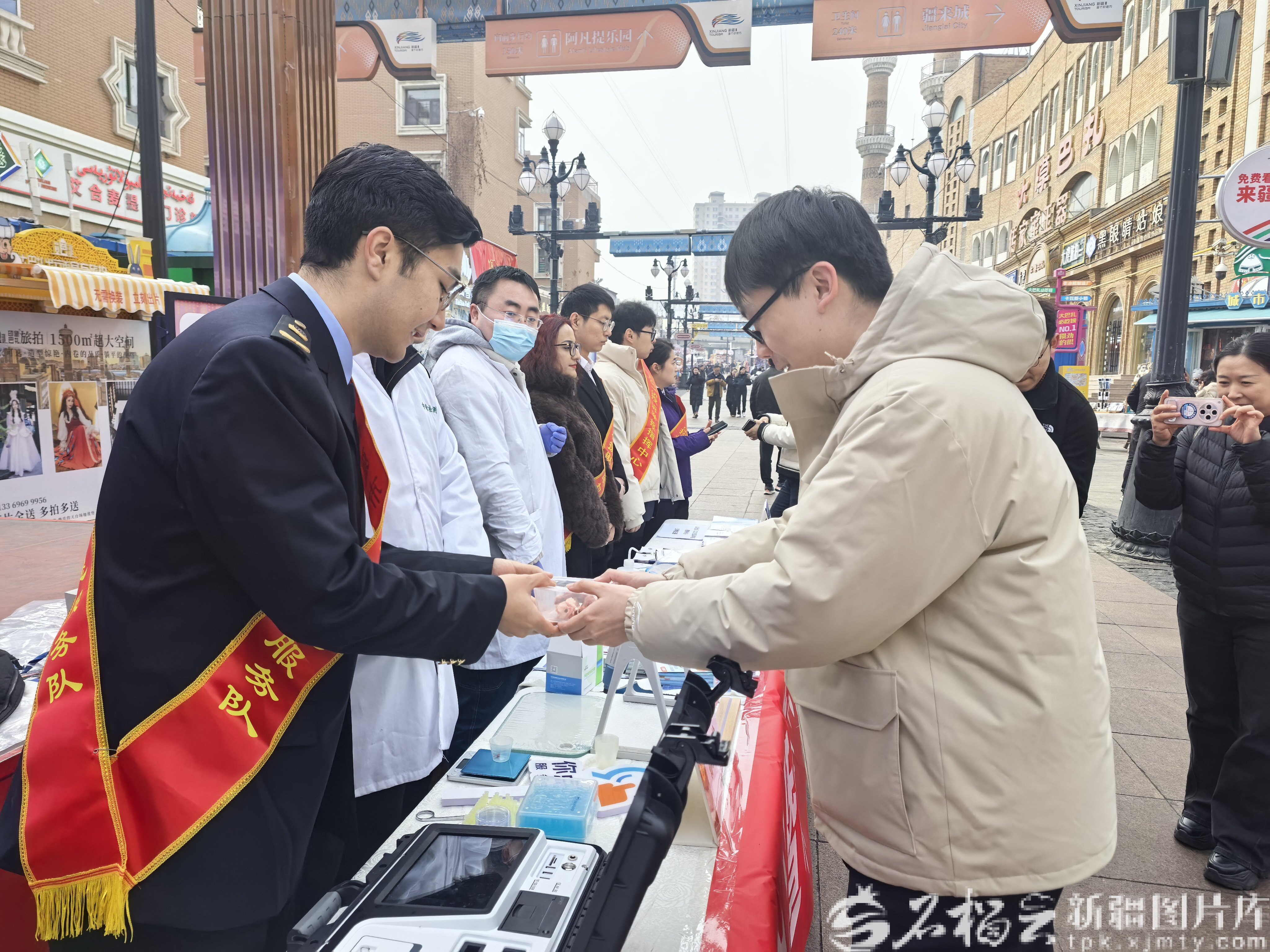 3月10日上午,在新疆国际大巴扎,一位市民参与“你点我检”活动。石榴云/新疆日报记者 索蓉芝摄