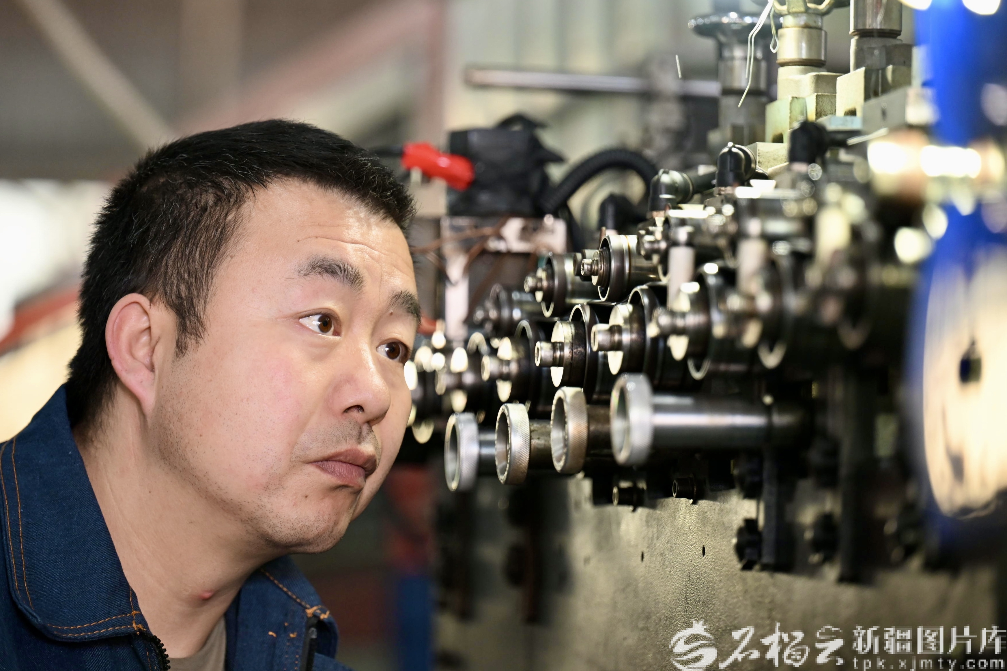 3月15日,昌吉市天力塑料厂生产车间,工作人员在滴灌带生产线上查看设备运行情况。