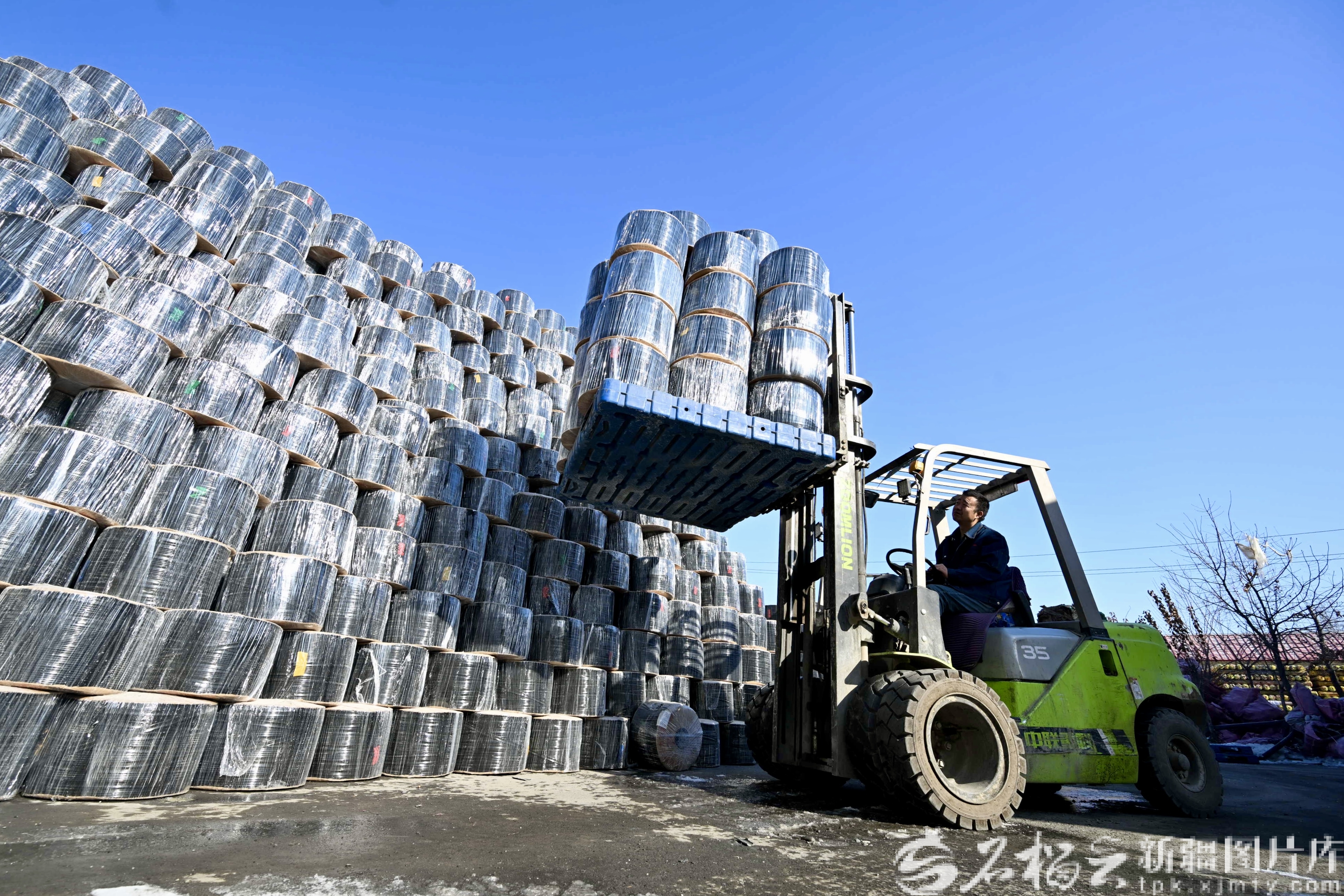 3月15日,昌吉市天力塑料厂,工作人员驾驶叉车将滴灌带码放整齐。