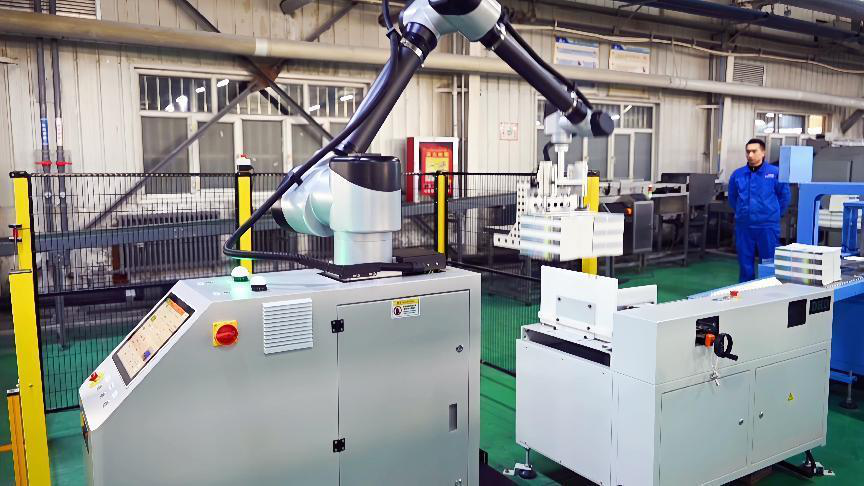 为降低人工成本、提高生产效率,该公司今年在胶钉龙自动打包线末端加装了智能码垛机器人。机械臂自动抓取、堆叠,将书本码放得整整齐齐;智能搬运机器人则有条不紊地穿梭,运送印刷成品。据新疆金版印务有限公司董事长侯正军介绍,机械手臂的应用将繁重的体力劳动转化为机器作业,使员工能够更专注于工艺优化。原先需要6人操作的环节,如今仅需一人负责监测与调试。