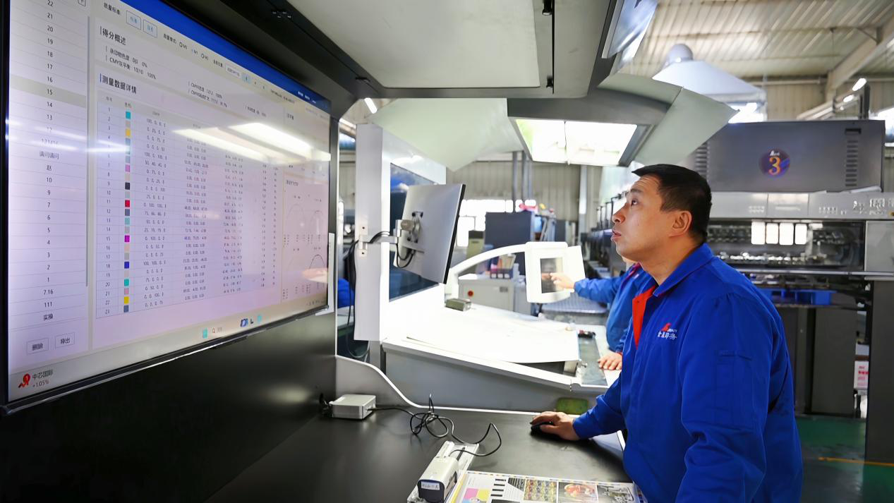 在质量检测环节,两台大型电脑检测设备引人注目。在线检测系统,可对印刷样张进行实时质量监测,及时发现墨点、墨皮等缺陷并报警;印刷质量印后检测系统,通过对网点扩大、点印率等数据进行大数据分析,为印刷人员提供精准报告,助力产品质量提升。平版印刷技师叶志强说:“这两台设备大大提升了印刷质量,减少了生产损耗”。