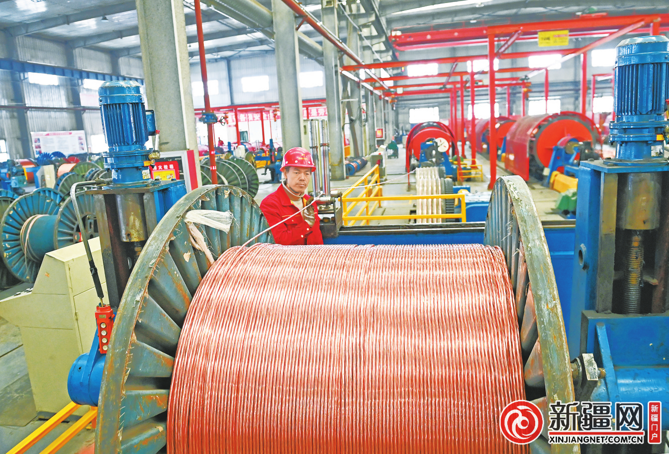 3月17日,在米东区新疆胡杨线缆制造有限公司生产车间,工作人员在流水线上生产作业。(记者陈岩摄)