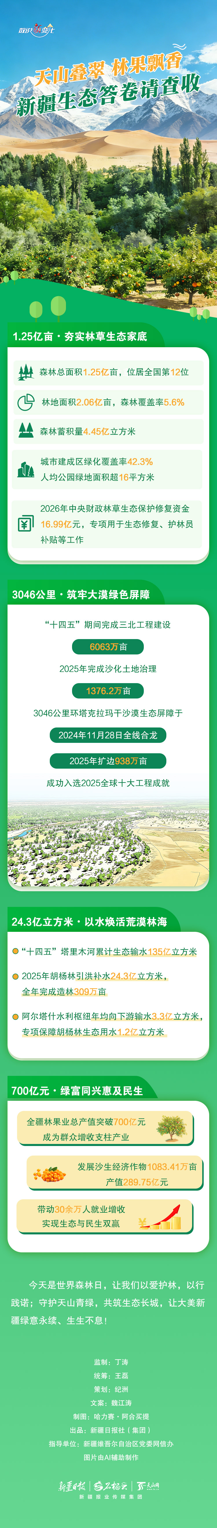 森林是新疆的生态根基,更是筑牢西北生态屏障的绿色脊梁。新疆森林总面积是多少?在全国排第几?新疆林果业总产值突破多少亿元?在世界森林日,本期《数说“新”变化》带你一起来了解新疆的“绿色家底儿”。