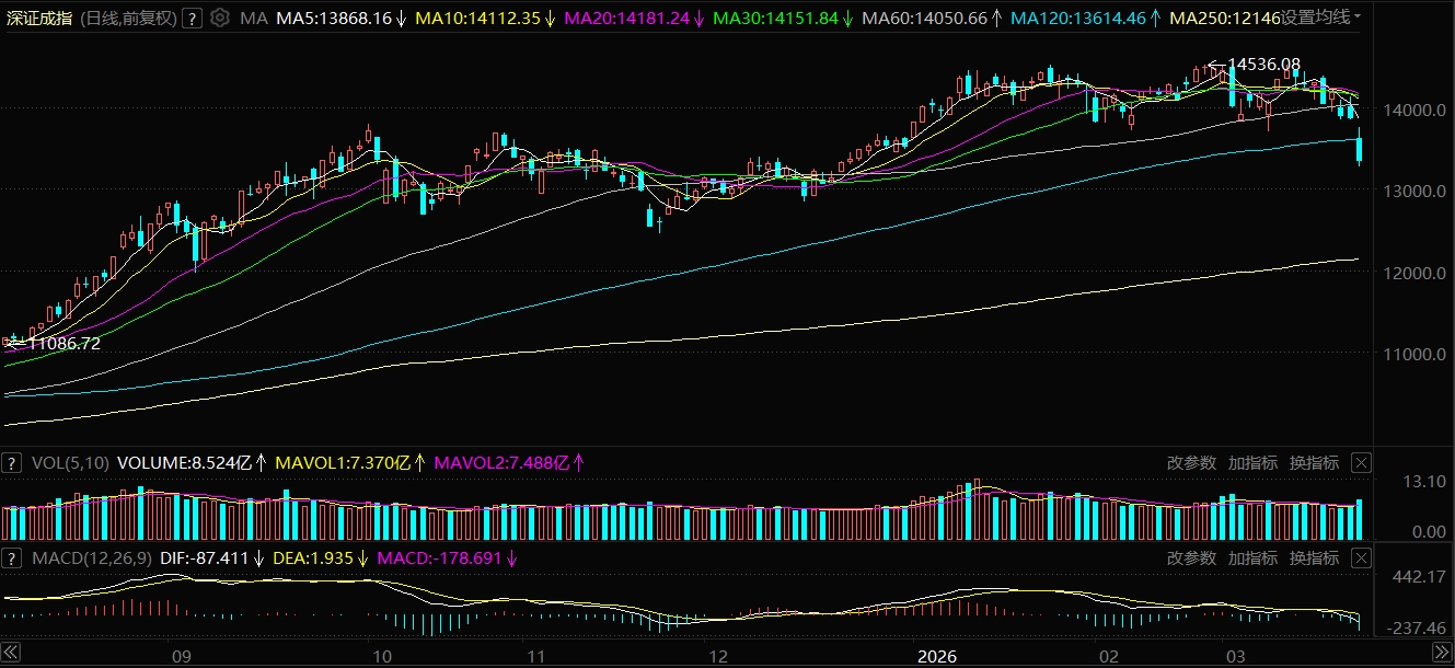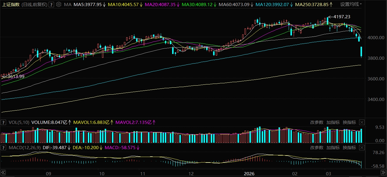 石榴云/新疆日报讯(记者 赵悦报道)A股三大指数今日集体走弱,三大指数均跌超3%,沪指退守3800点关口。截至收盘,沪指跌3.63%,收报3813.28点;深证成指跌3.76%,收报13345.51点;创业板指跌3.49%,收报3235.22点。沪深京三市成交额达到2.45万亿元,较上一交易日放量1454亿元。