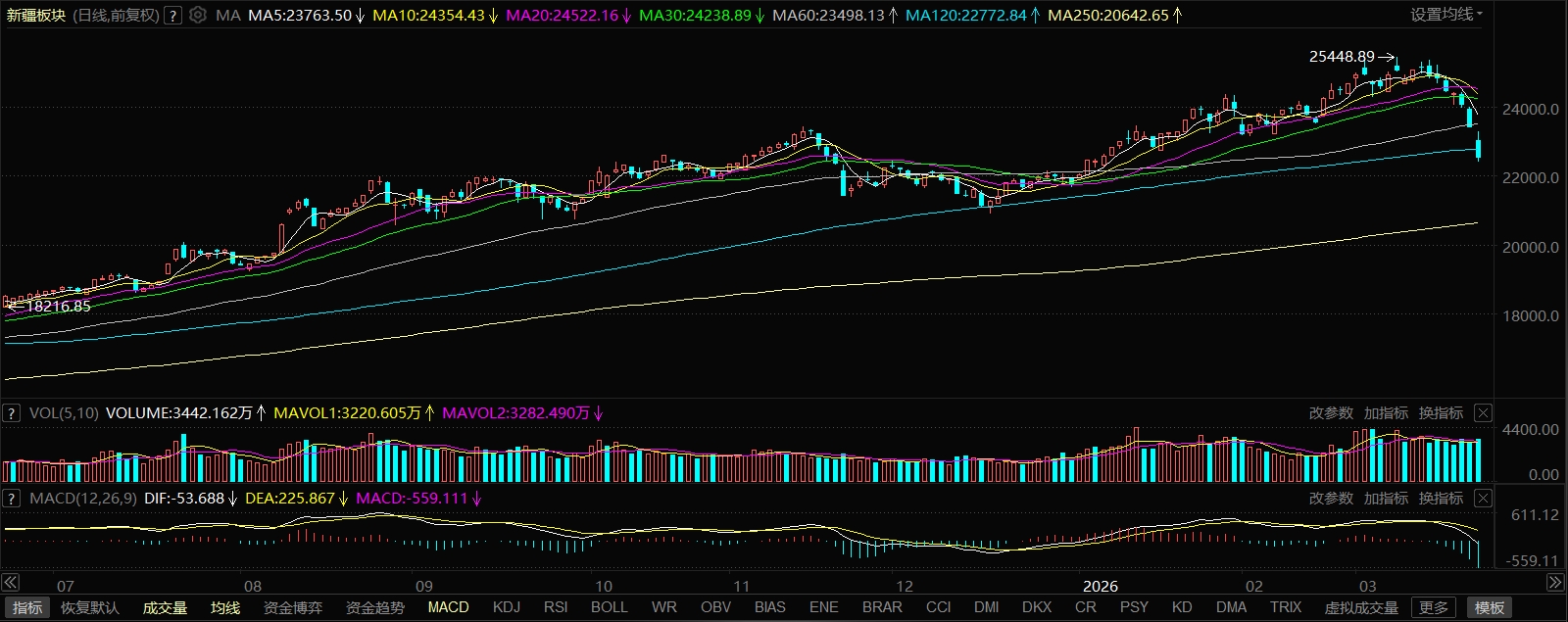 3月23日A股收盘时,新疆板块指数跌3.77%,报收22523.55点,11只股票上涨,51只股票下跌,个股上涨比例为17.74%,总换手率3.03%,总成交额395.27亿元。
