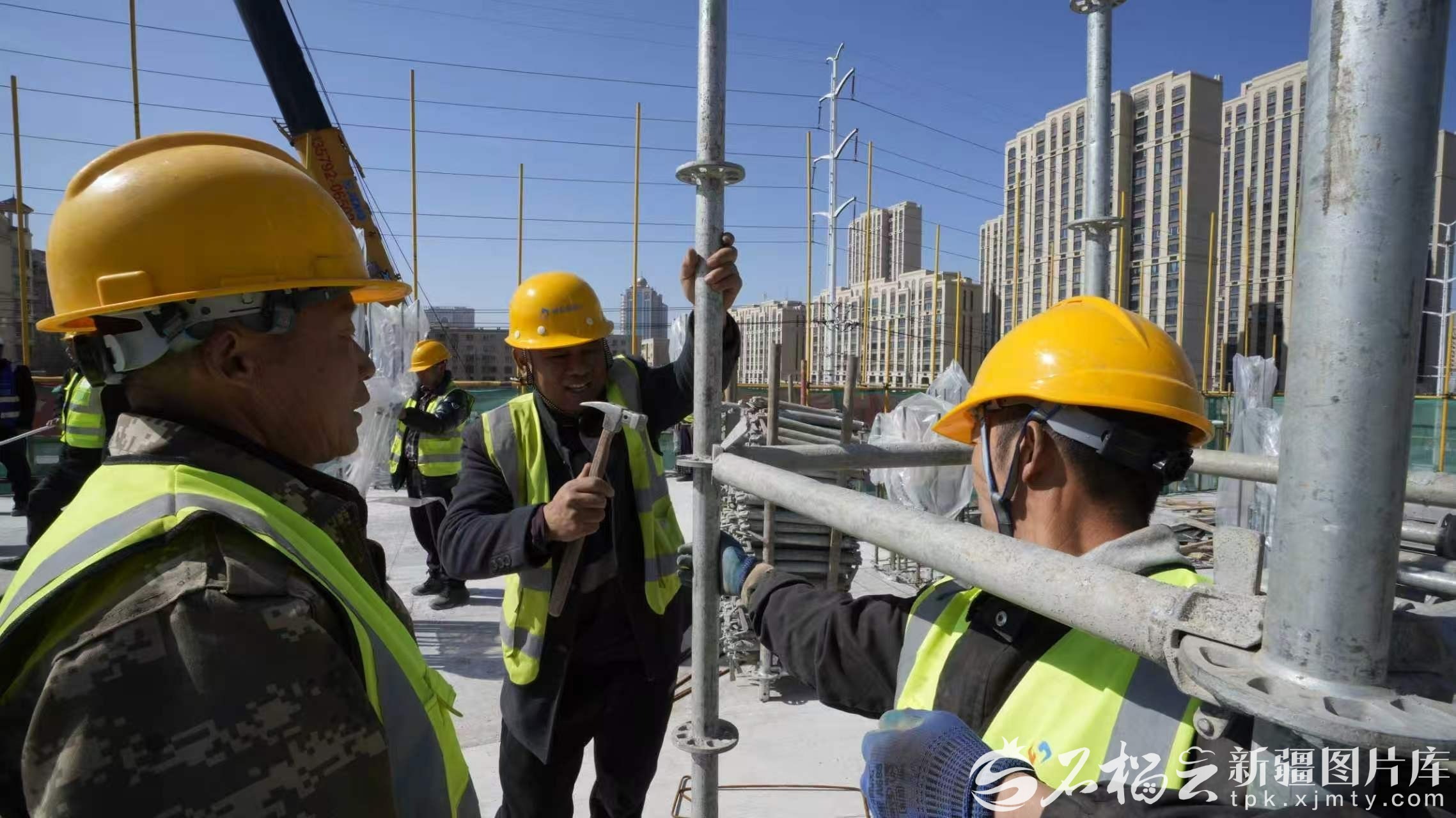 3月23日,中湾街商业步行街项目建设现场2号合院商业楼区,施工人员搭设盘扣架体。李嘉华摄