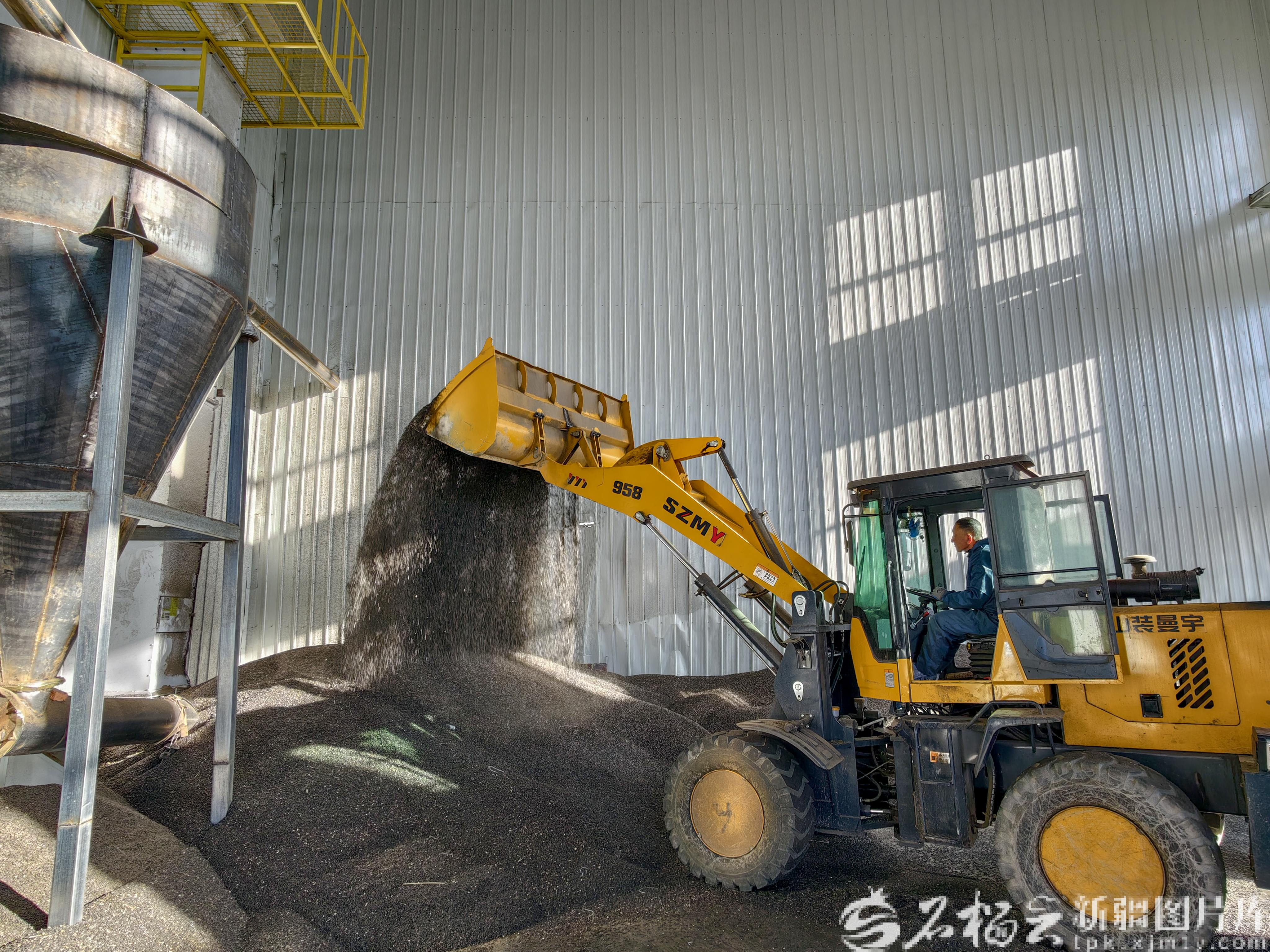3月26日,新疆青耕国际商贸有限公司生产车间内,工人正在收集榨油后的油渣。
