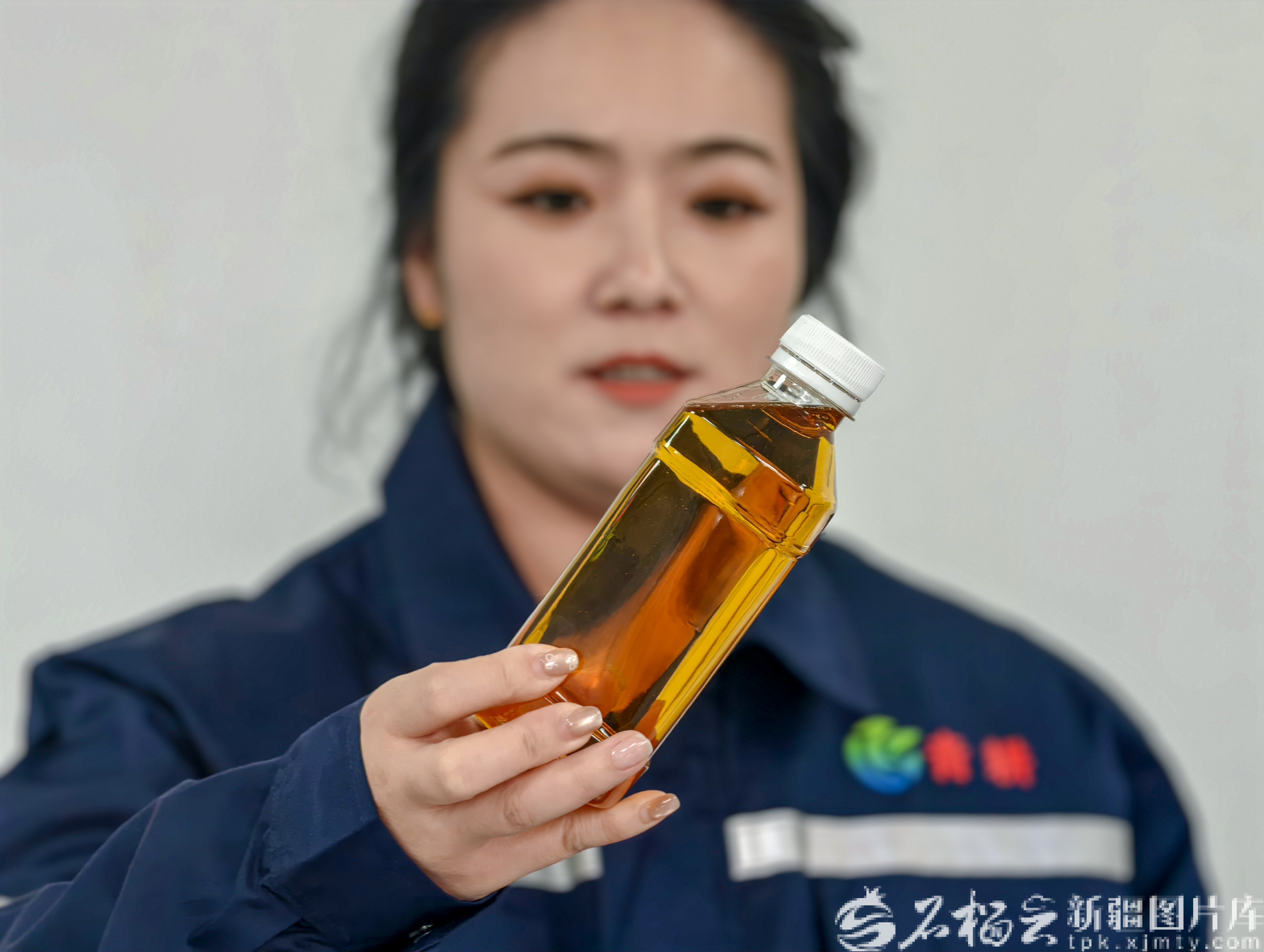 3月26日,新疆青耕国际商贸有限公司,工作人员正在观察刚生产出的食用油。