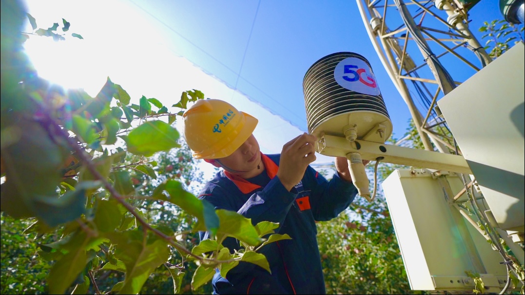 阿克苏的果园内,中国电信维修人员维护墒情监测仪器图。