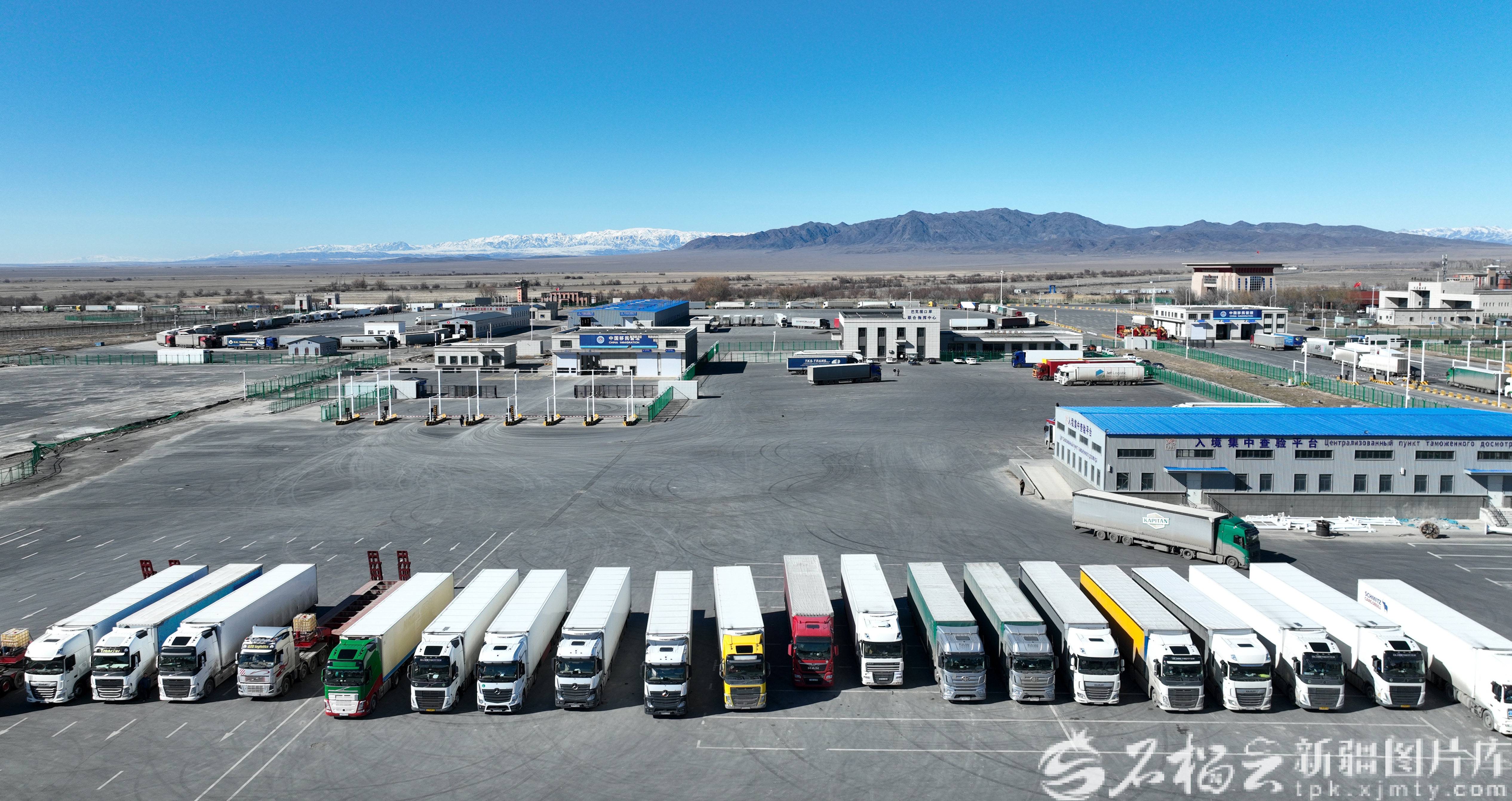3月25日,塔城巴克图口岸,跨境货运车辆有序排队等候通关。周鹏摄