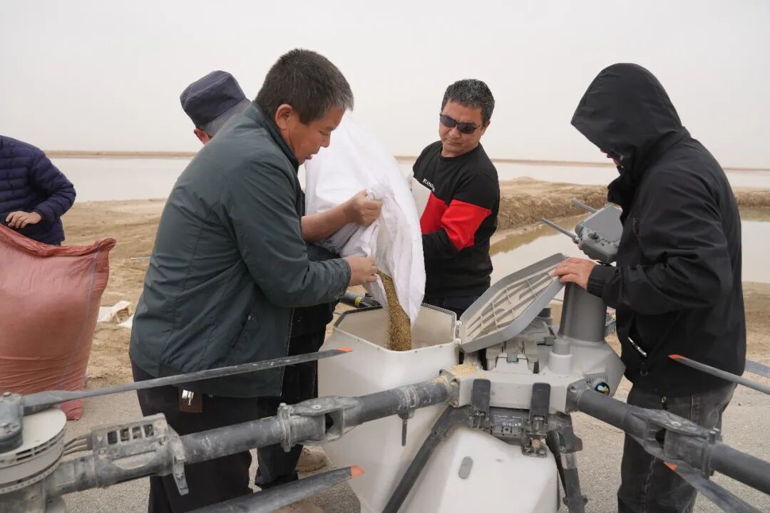 工作人员将精心筛选的红柳、盐穗木、碱蓬、黑枸杞等适配荒漠生长的本土沙生植物种子,装填至植保无人机机舱。