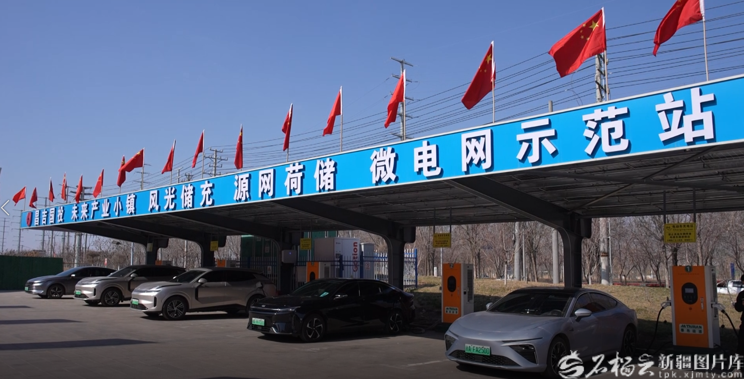 4月2日,昌吉市市民服务中心风光储充一体化微电网充电站,该充电站采用光伏车棚和风电机组,将太阳能、风能转化为绿色电能,实现清洁能源的自发自充。刘昊清 摄