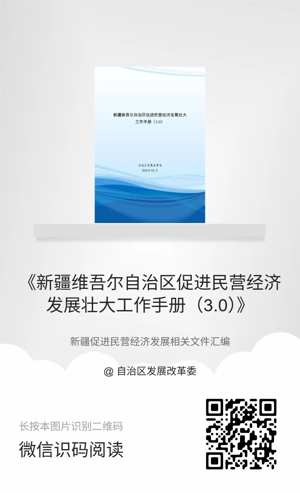 图为《新疆维吾尔自治区促进民营经济发展壮大工作手册(3.0)》封面及电子版查阅二维码。