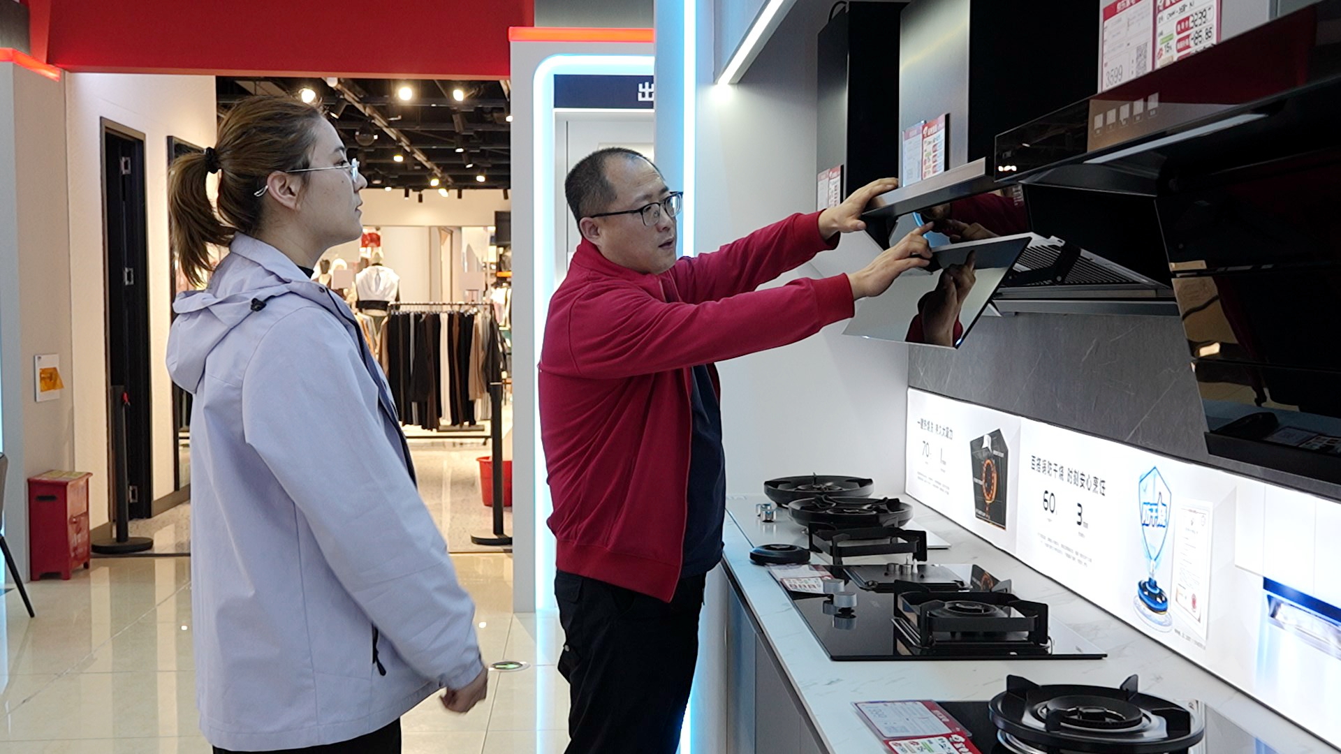 顾客在店长的介绍下了解产品的区补优惠政策。