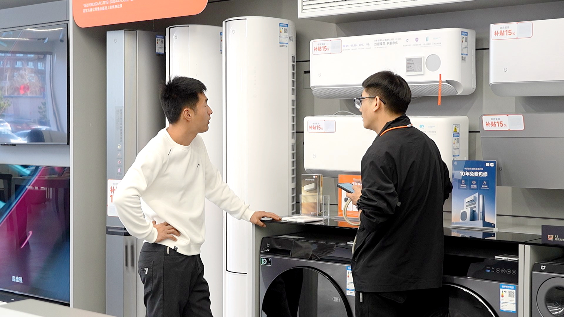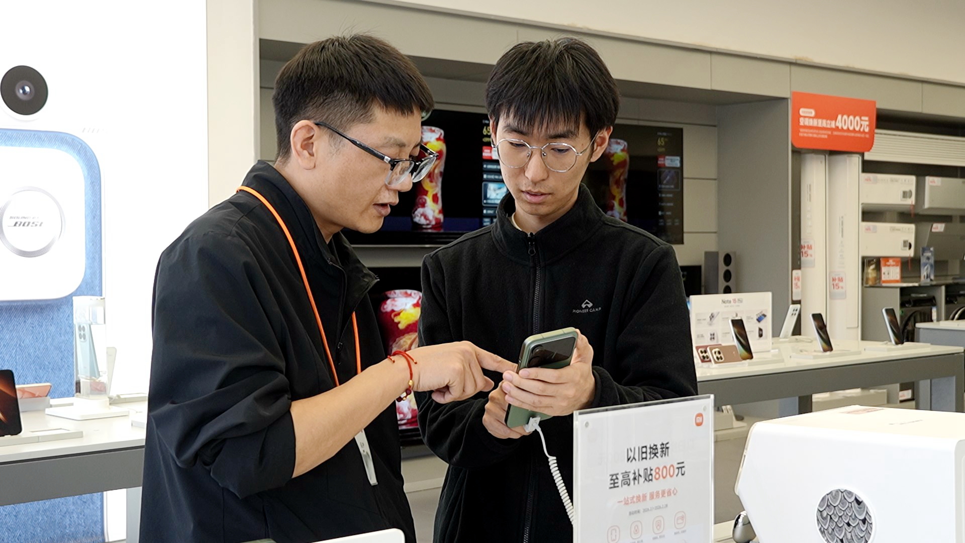 小米之家店内店长向顾客介绍国补优惠政策。
