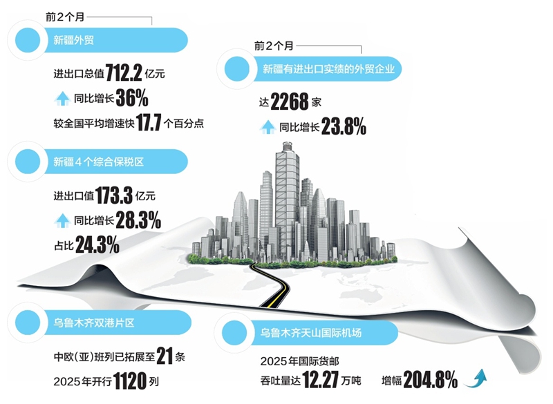 乌鲁木齐海关数据显示,今年前2个月,全疆外贸进出口总值712.2亿元,同比增长36%,较全国平均增速快17.7个百分点,交出亮眼成绩单。