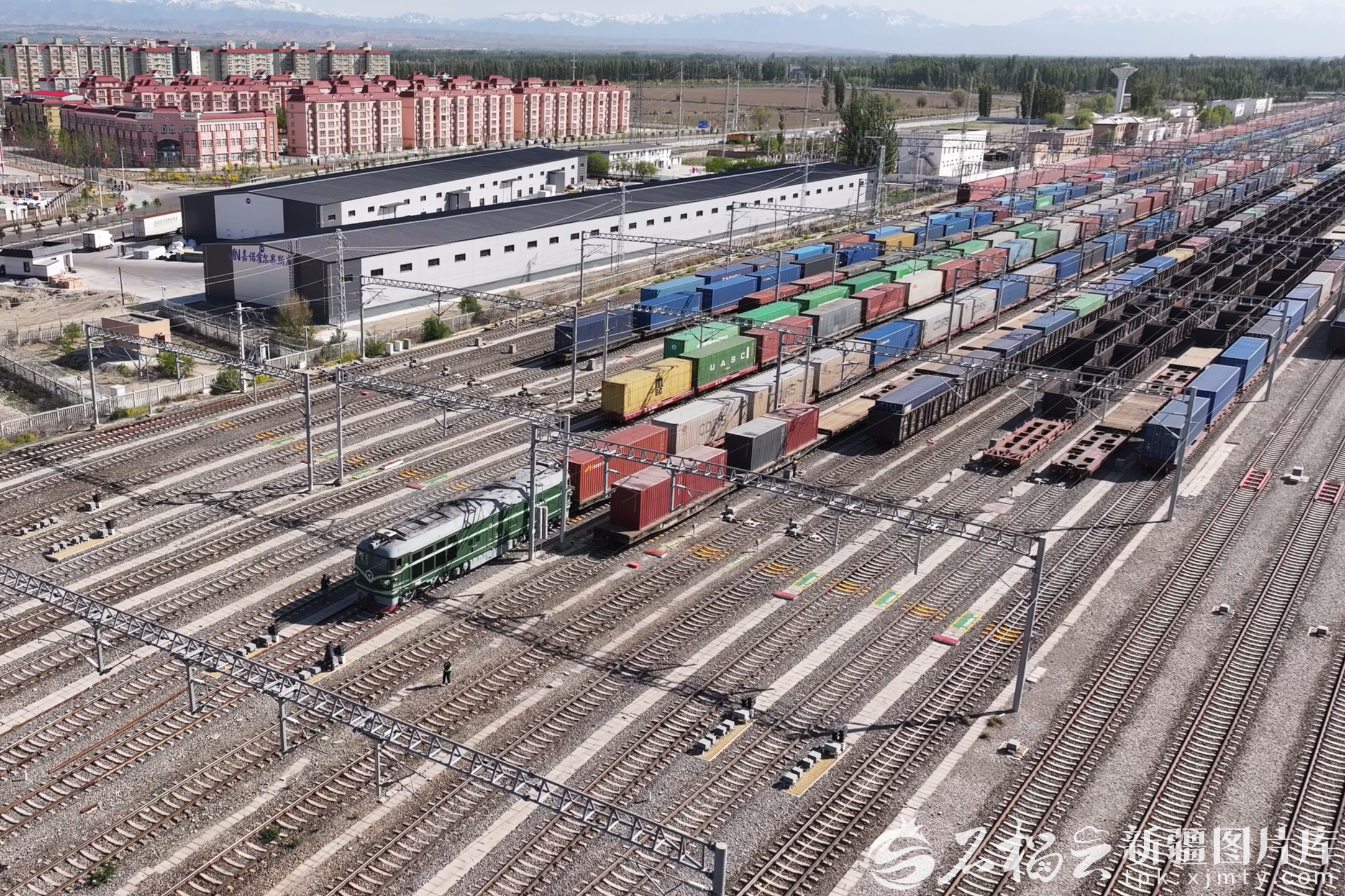 4月21日,霍尔果斯铁路口岸内,一列班列从准轨场驶出。冯海森摄