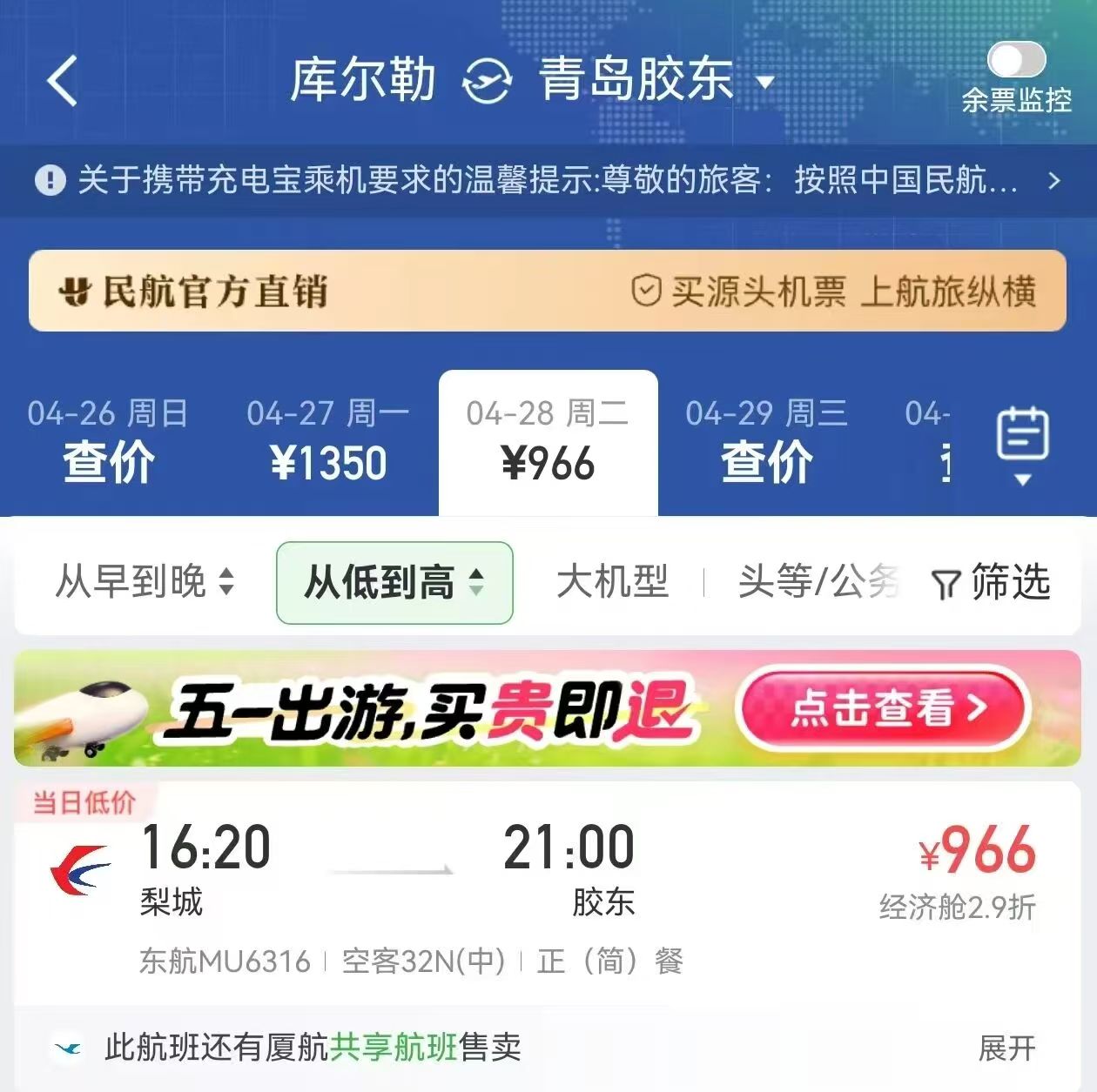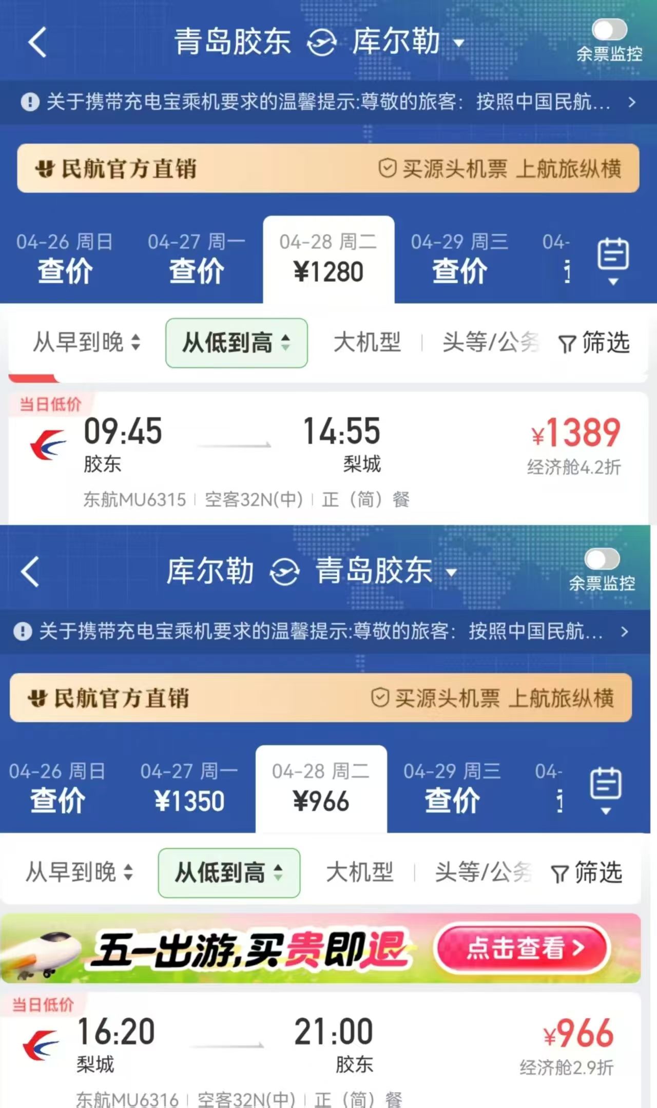 该航线具体班期为每周二、四、六执飞,时刻为9时45分从青岛出发,14时55分到达库尔勒,16时20分从库尔勒出发,21时到达青岛,航班时刻充分考虑短途旅行需求,为周末“微度假”及小长假出行提供了极高便利,旅客可通过各大售票平台及航司官方渠道查询预订。