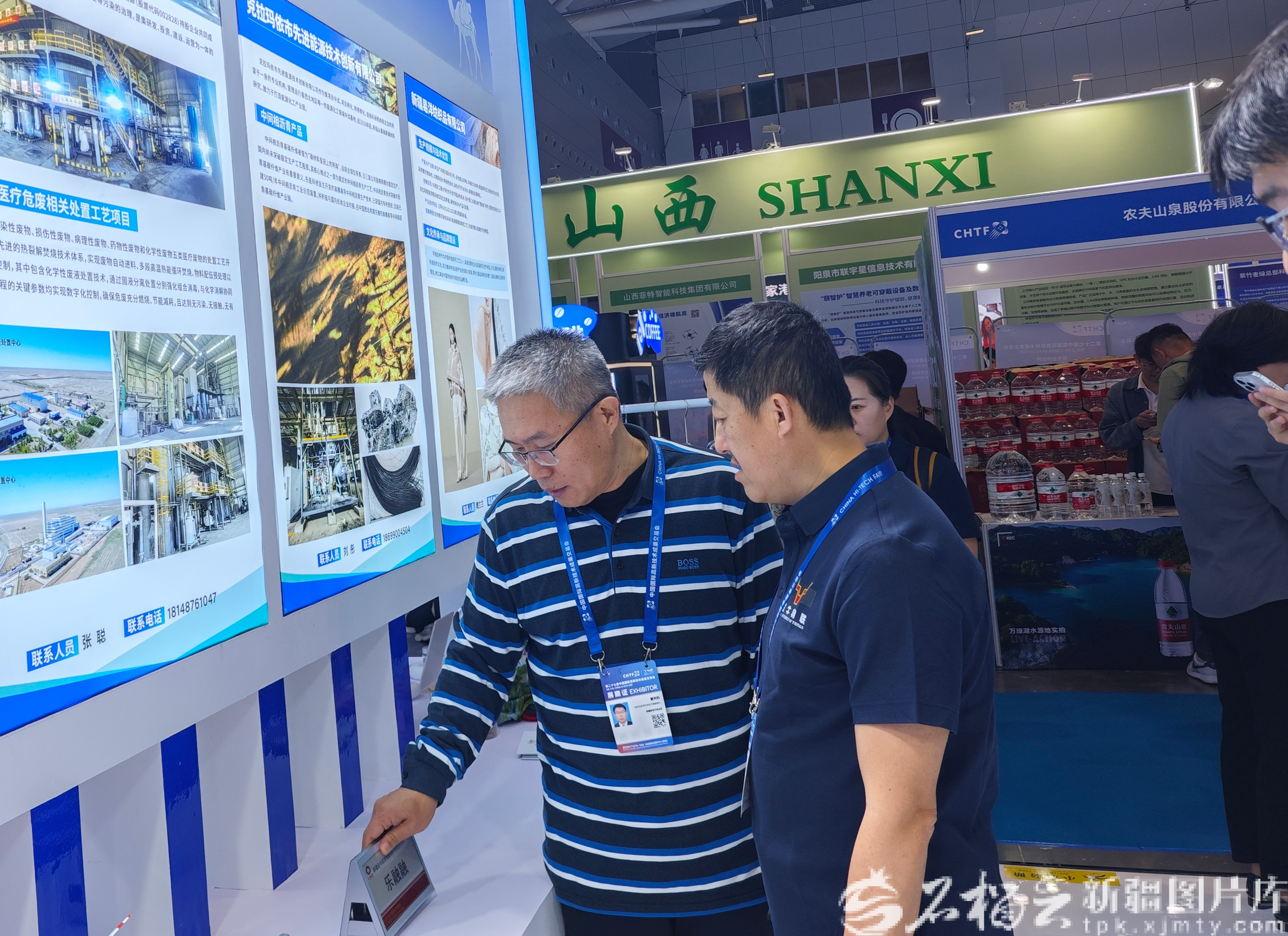 新疆金牛能源物联网科技股份有限公司常务副总经理孙长江(右一)介绍智能电子桌牌。受访者供图