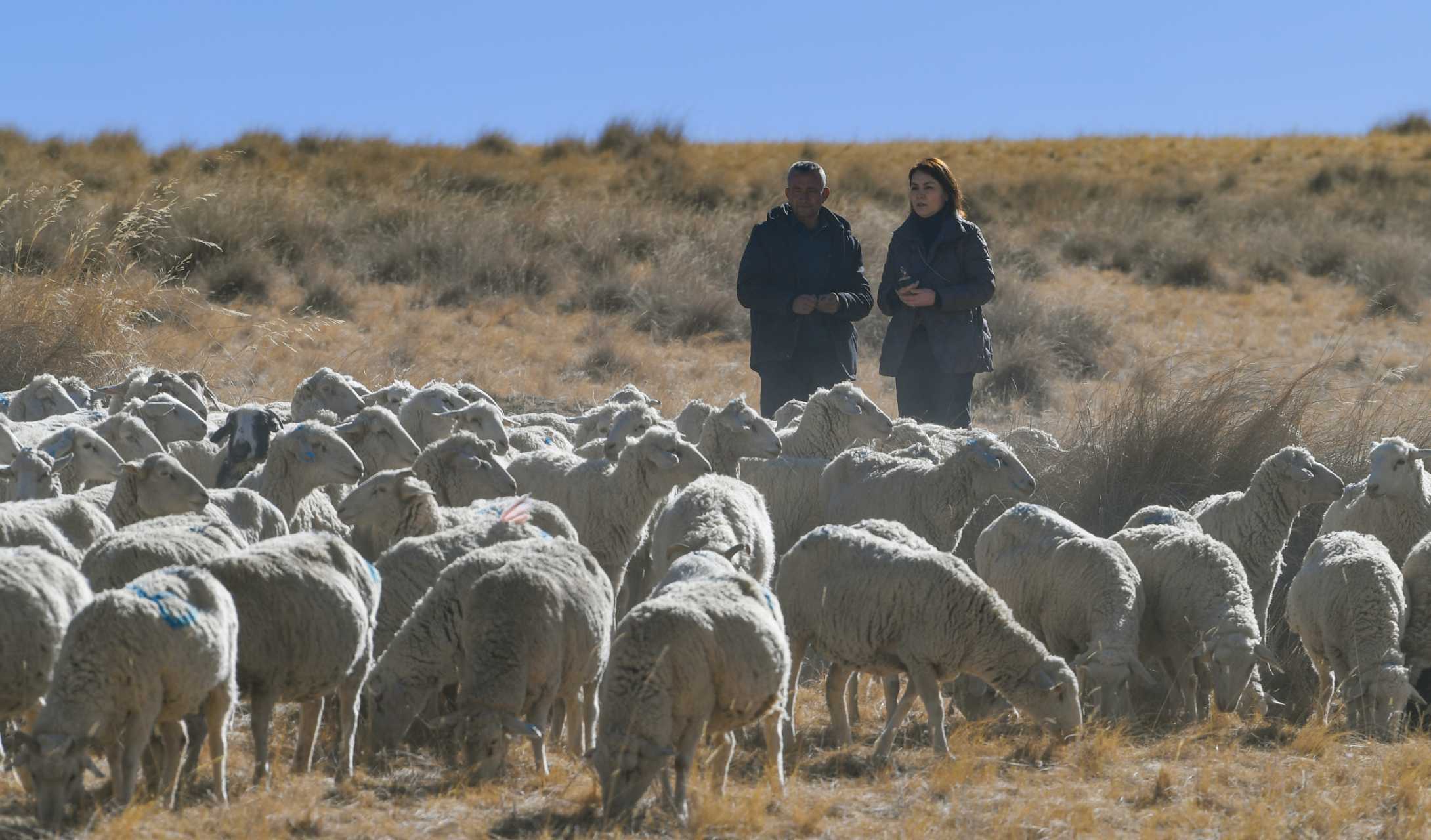 在海拔3600米的昆仑山脚下,石榴云/新疆日报记者拍热扎提·阿不都(右)与策勒县奴尔乡其曼巴格村牧民伊敏托乎提·麦提图尔荪一起放羊。策勒县融媒体中心供图