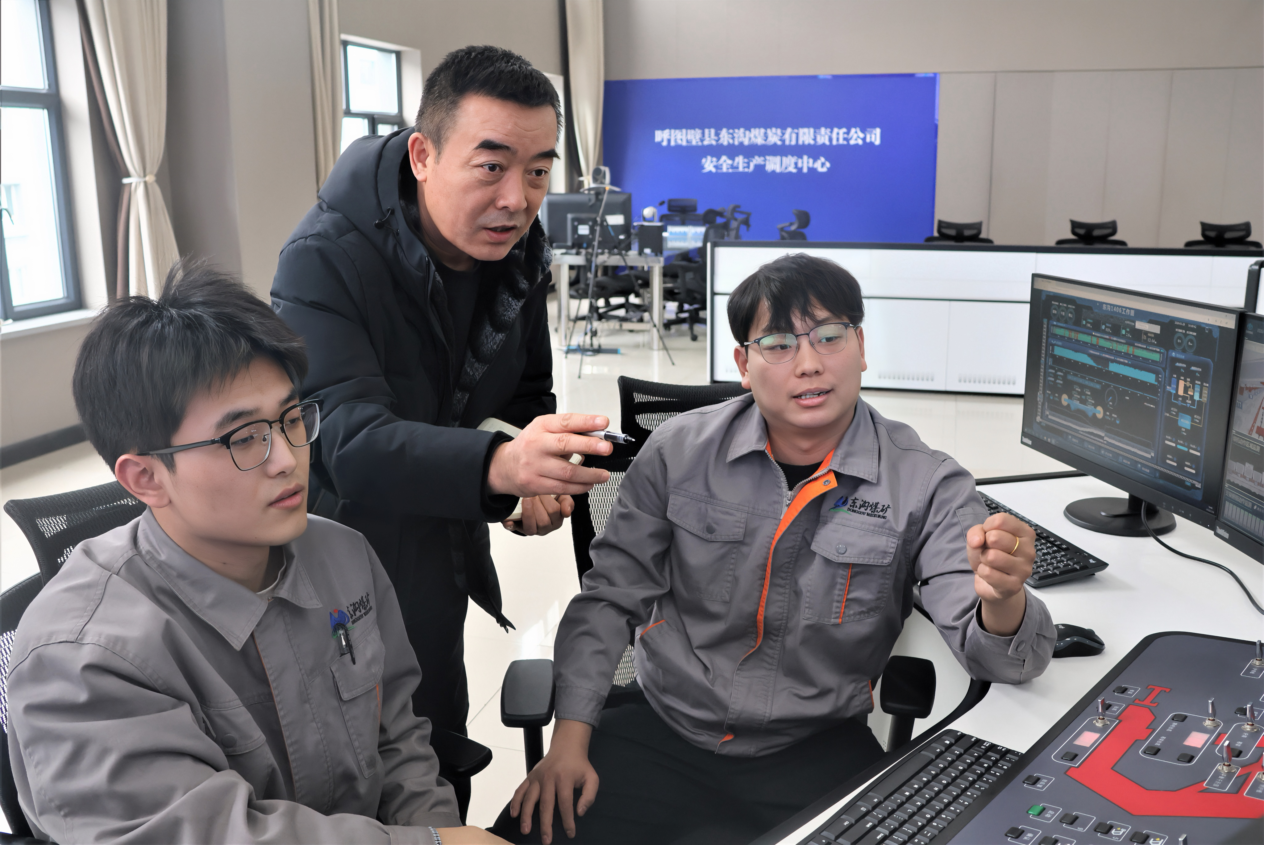 2月1日,石榴云/新疆日报记者盖有军(中)在呼图壁县东沟煤炭有限责任公司采访。程勇摄