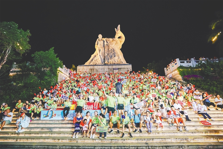 ①10月1日晚,三亚鹿回头风景区举办的荧光登山夜跑活动吸引了众多市民游客参与。