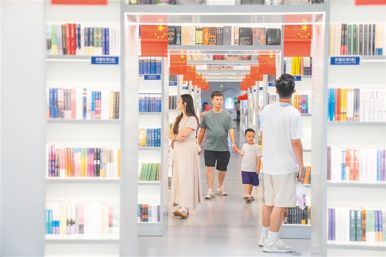 ②10月1日,不少市民来到海口日月广场的新华书店,在阅读中迎接国庆节。为庆祝国庆,新华书店里到处悬挂着五星红旗,大屏幕上显示着“热烈庆祝中华人民共和国成立75周年”字样,烘托出浓厚国庆氛围。