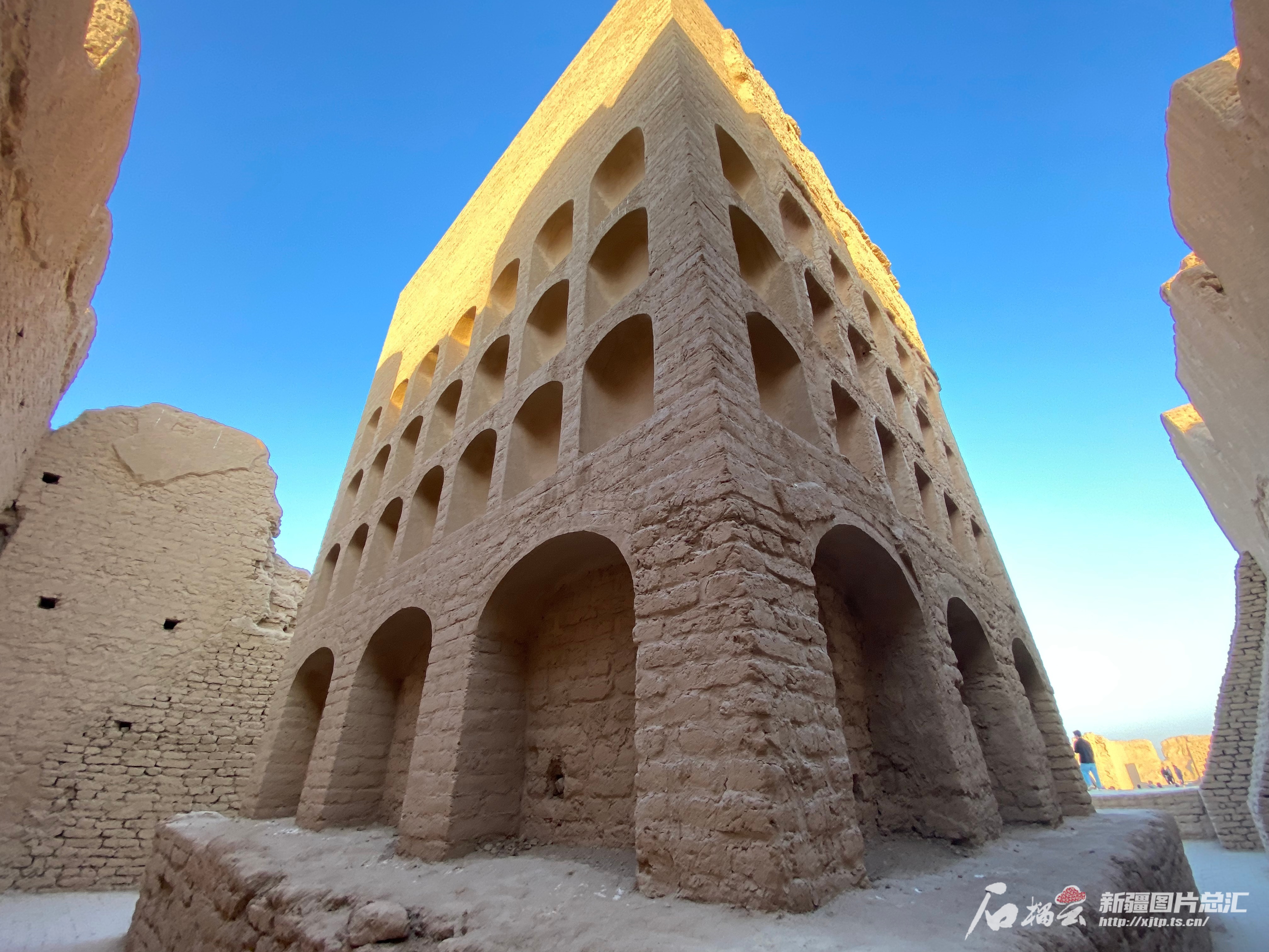 继续往前走,来到了位于故城中心土台地上的可汉堡遗址。走进堡内,北面的高台上有座高达15米的方形塔建筑。土台西侧有一座上下层建筑,现仅存地下部分,南、西、北三面有宽大的阶梯式门道,规模虽不大,但与交河故城现存唐代最豪华的官署衙门的建筑形式相同,可能是宫殿遗址。