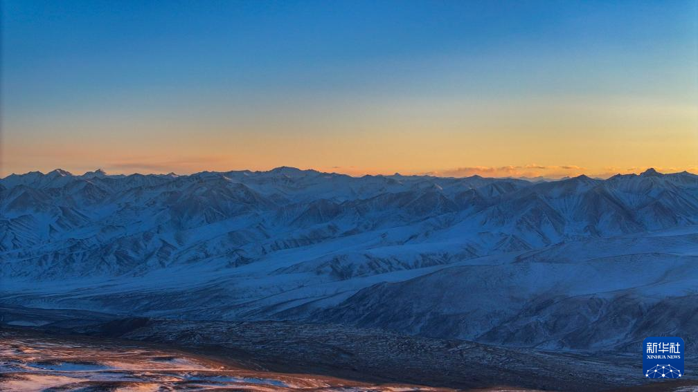 这是夕阳下慕士塔格峰周边的昆仑山脉(1月12日摄,无人机照片)。