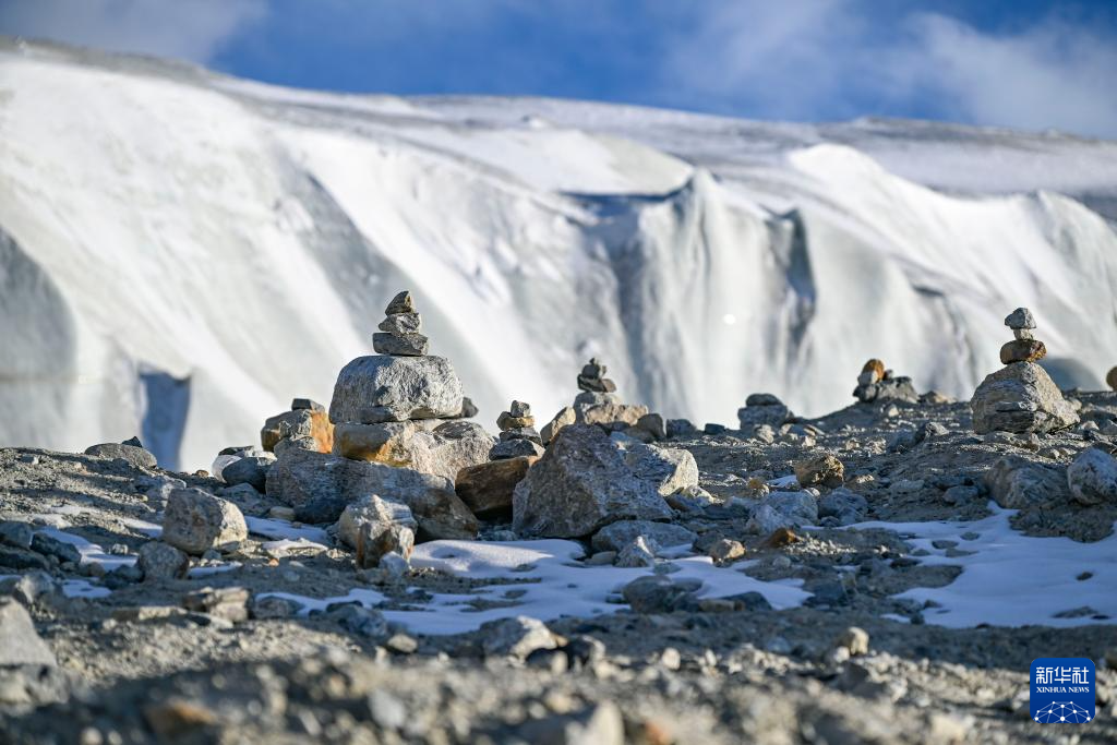 这是在新疆塔什库尔干塔吉克自治县慕士塔格冰川公园拍摄的游客摆放的祈福石堆(1月12日摄)。