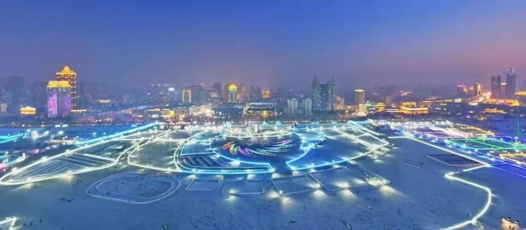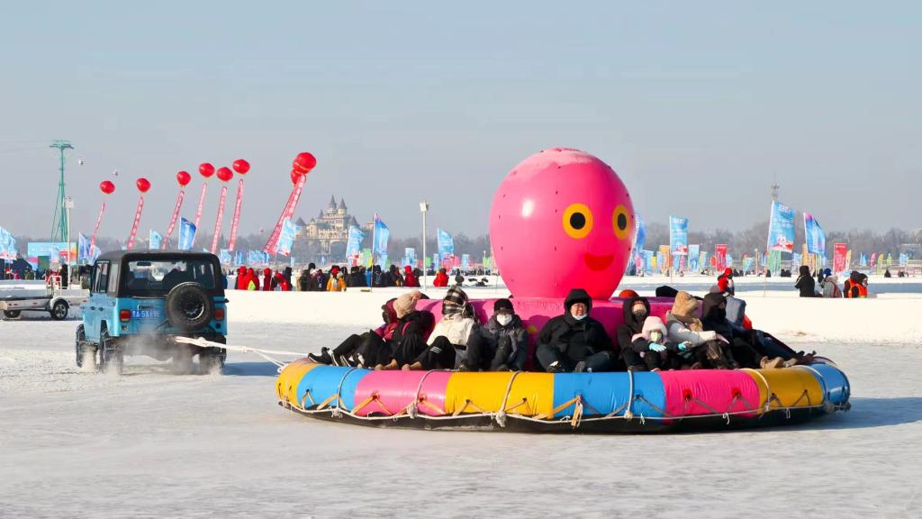和往年不同今年冰封的松花江上的冰雪娱乐园区可谓一眼望不到头这句话一点不夸张因为从道外区到道里区的江边十几公里的长度分布着各种冰雪娱乐场地