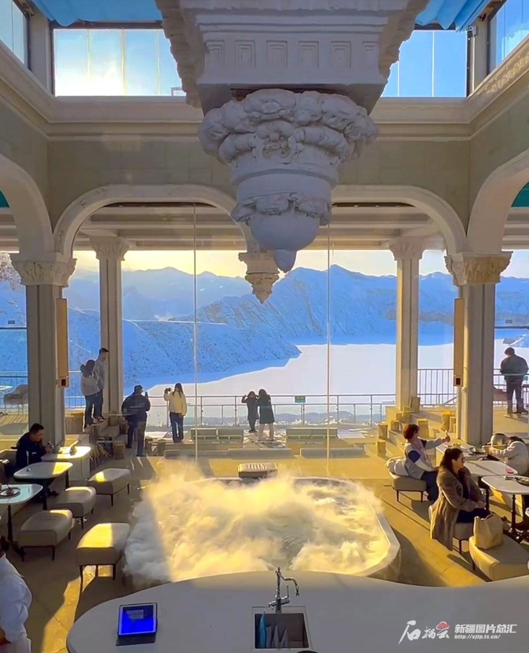 咖啡厅正中间有一个巨大的水雾池,让咖啡厅有了灵动感,里面的水雾总是满满一池,游客都喜欢坐在池边,以雪山和湖水为背景拍照。