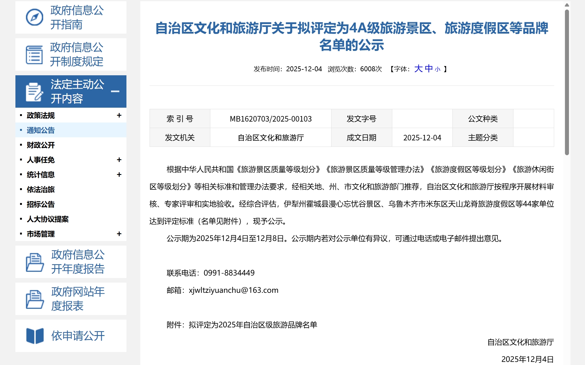 12月4日,自治区文化和旅游厅发布《关于拟评定为4A级旅游景区、旅游度假区等品牌名单的公示》,经相关地、州、市文化和旅游部门推荐,自治区文化和旅游厅按程序组织综合评定,伊犁州霍城县漫心忘忧谷景区、乌鲁木齐市米东区天山龙脊旅游度假区等44家单位达到评定标准。