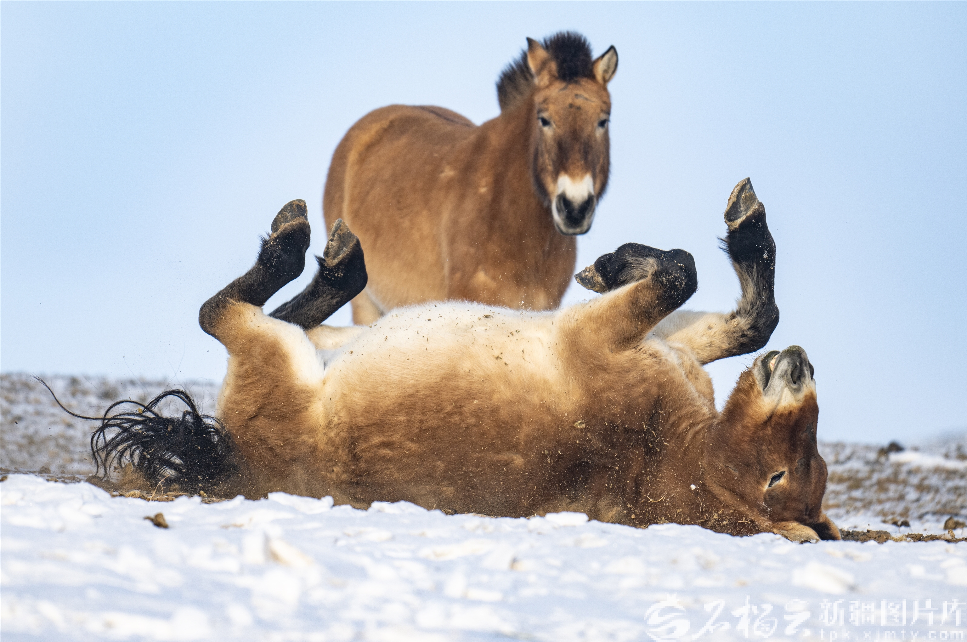 12月18日,新疆卡拉麦里山有蹄类野生动物自然保护区乔木西拜普氏野马监测站,普氏野马在雪地里打滚撒欢。何龙摄