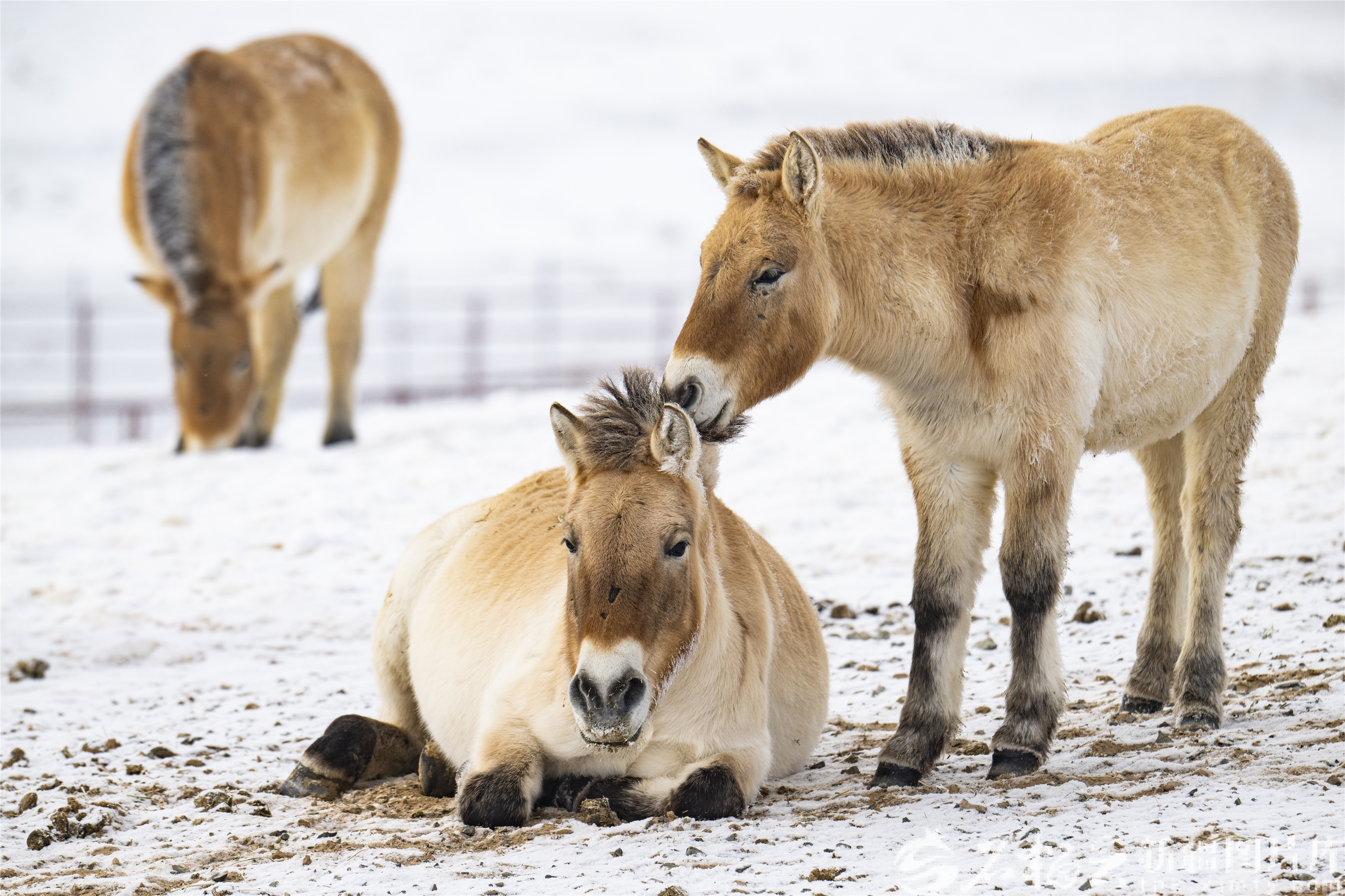 12月18日,新疆卡拉麦里山有蹄类野生动物自然保护区乔木西拜普氏野马监测站,普氏野马在雪地里栖息。何龙摄