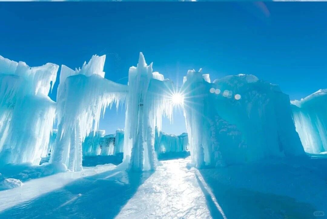 在她的视频中,开阔的湖岸矗立起层层叠叠的冰壁,在阳光下折射出深邃灵动的蓝光,宛如湖水凝固成垂直帷幕。远处雪山静默,脚下冰面如墨玉般流淌——“大西洋最后一滴眼泪”在零下20摄氏度的怀抱中,将自己凝固成一首立体的冬日诗篇。