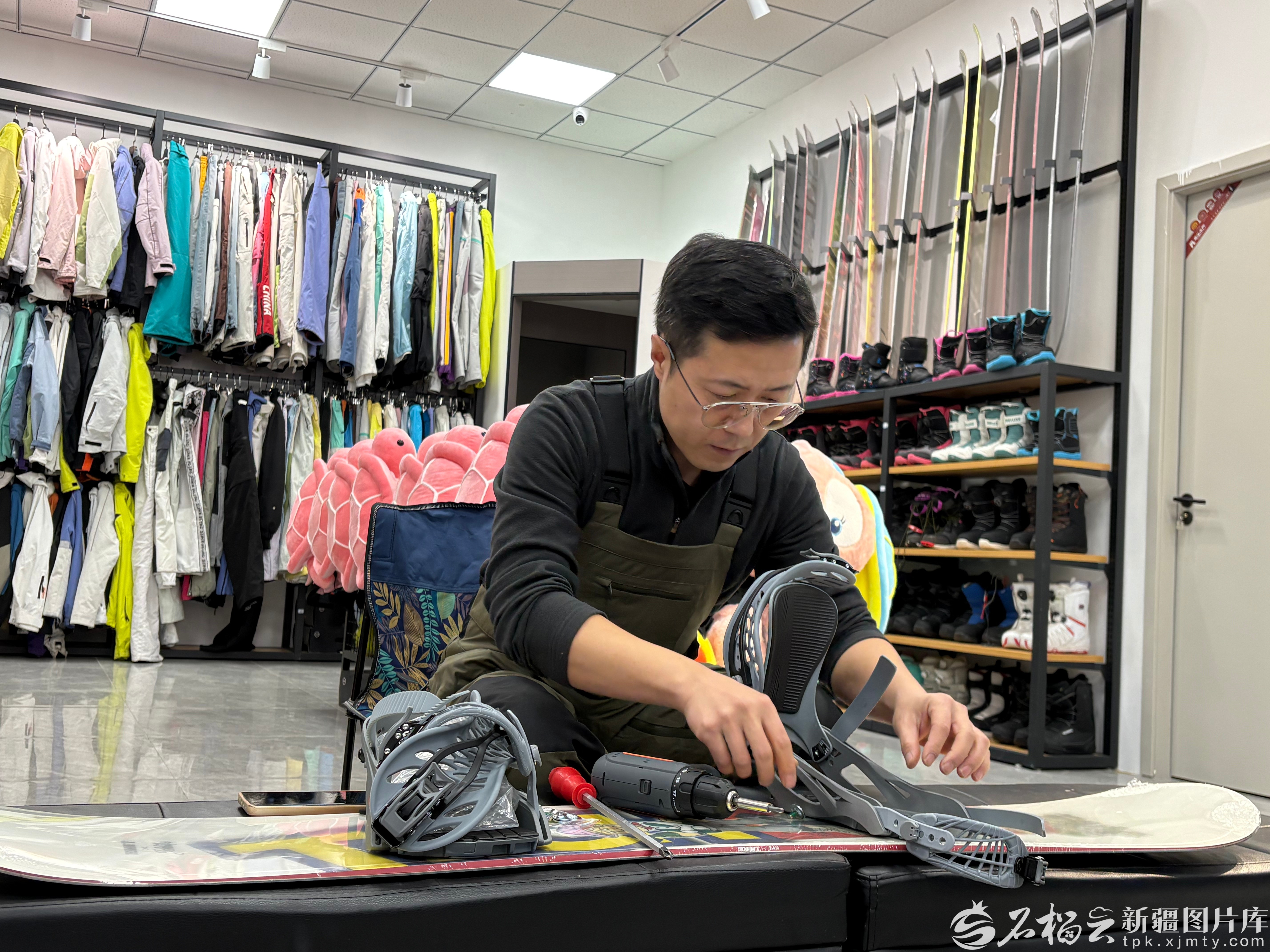 彩虹雪雪具库负责人贺秦正在为客人组装雪具。石榴云/新疆日报记者 王晶晶摄