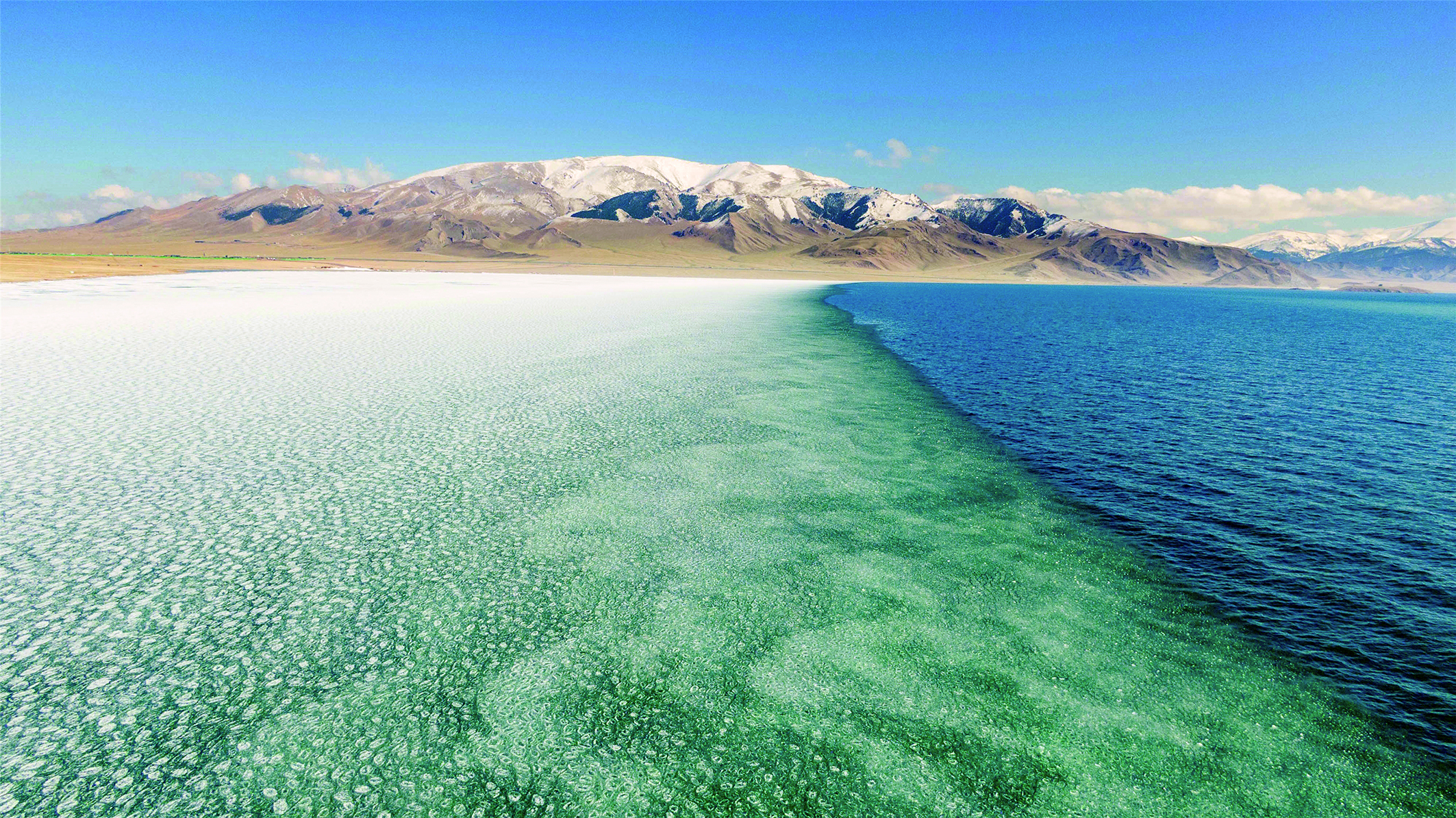 昼夜温差使湖水在夜间迅速凝结,层层薄冰随波涌动,相互撞击,发出清越如环佩相击的泠泠声响。白昼来临,神奇的冰推景象徐徐展开——浮冰被湖水推至岸边,堆积成晶莹锐利的“蓝冰”,宛如破碎的水晶玻璃,与湛蓝湖面相映,勾勒出“半湖脂玉半湖蓝”的独有画卷。风浪淘洗之下,初生的碎冰渐渐磨去棱角,化作圆润冰球轻漾于碧波之上。这般绝色,亦曾亮相北京冬奥会开幕式“二十四节气”倒计时短片,凝萃成一帧动人的中国冰雪意象。