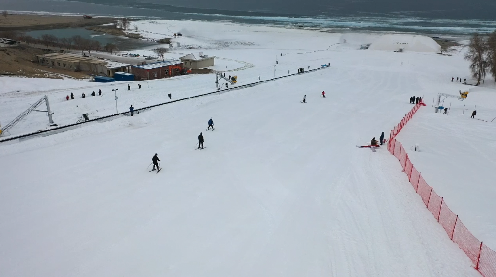 据了解,滑雪场占地面积约9.8万平方米,坐拥“面朝冰湖、背倚金沙”的独特景观。冰封辽阔的博斯腾湖与连绵起伏的金色沙漠交相辉映,构成“一湖一沙一雪场”的壮丽画卷,成为其最大亮点。场内设有滑雪道与雪圈道,可满足从初学者到进阶玩家的全人群需求。其中两条中级道长度分别为1314米与520米,兼具挑战性与趣味寓意,尽享速度与激情。