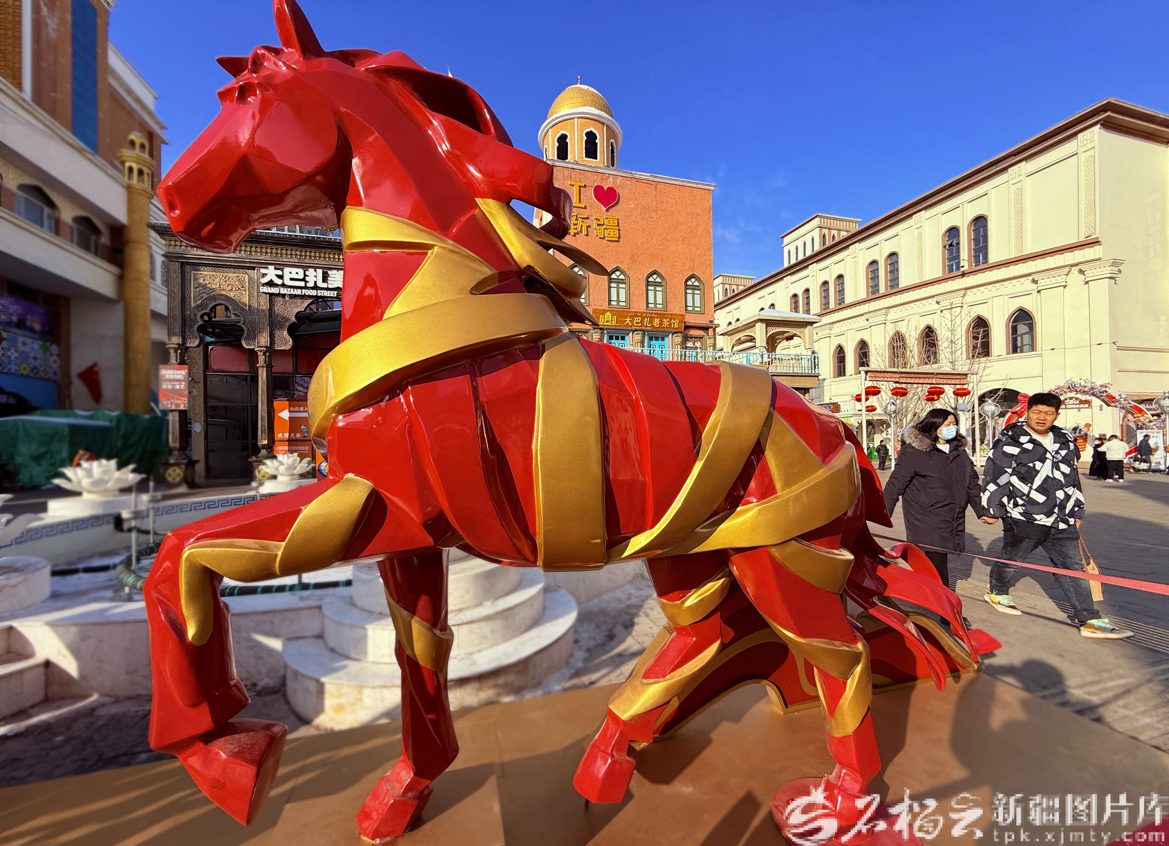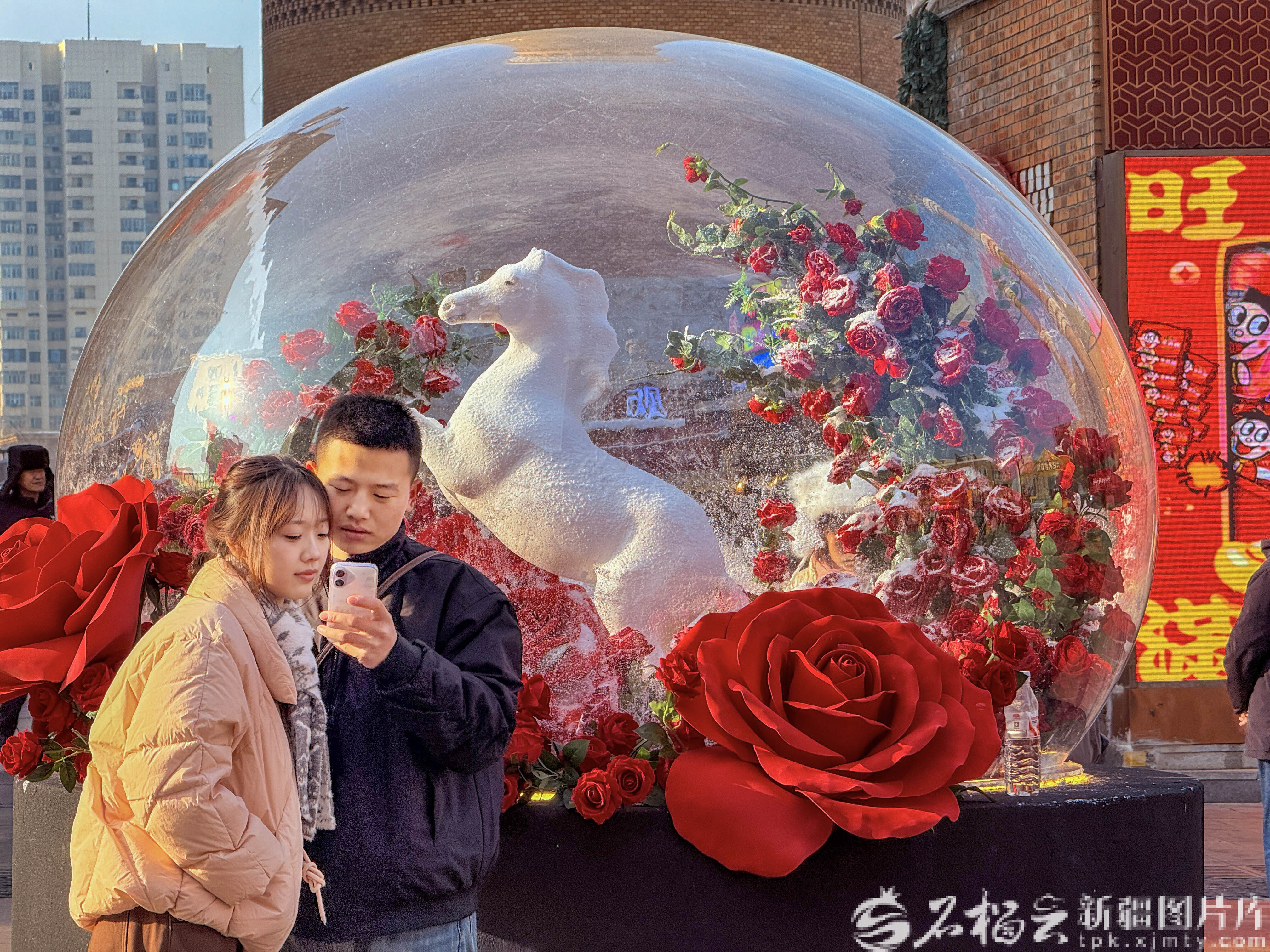 1月8日,新疆国际大巴扎,白色骏马玻璃球造型景观吸引游客拍照打卡。