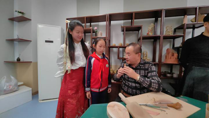 李锋向学生讲解紫砂古埙制作流程。资料图