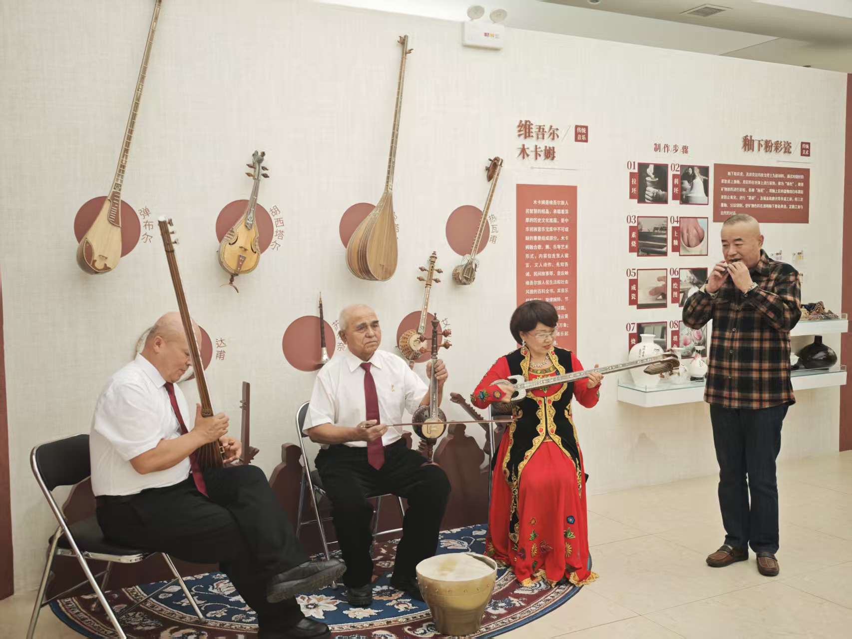 李锋(右一)在克拉玛依市文化馆向演奏紫砂哨埙。资料图