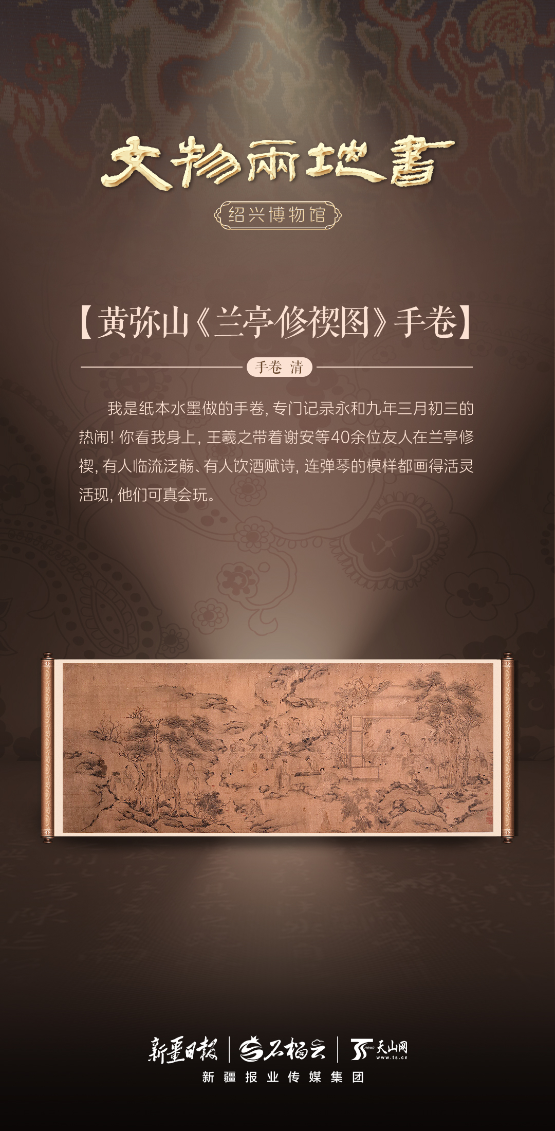 我是纸本水墨做的手卷,专门记录永和九年三月初三的热闹!你看我身上,王羲之带着谢安等40余位友人在兰亭修禊,有人临流泛觞、有人饮酒赋诗,连弹琴的模样都画得活灵活现,他们可真会玩。