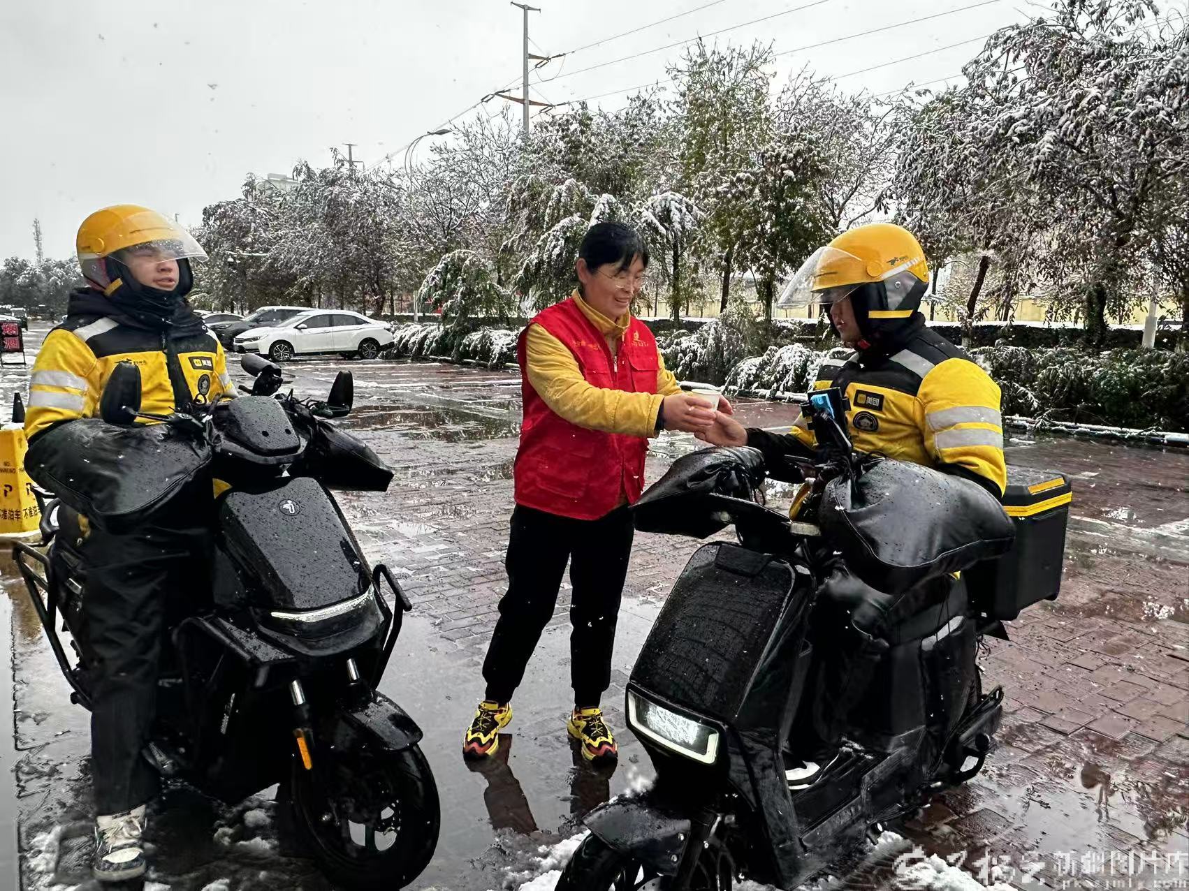 寒冬时节,乌鲁木齐高新技术产业开发区(新市区)长春中路街道长春北路社区工作人员为快递员送上热水。刘丹摄
