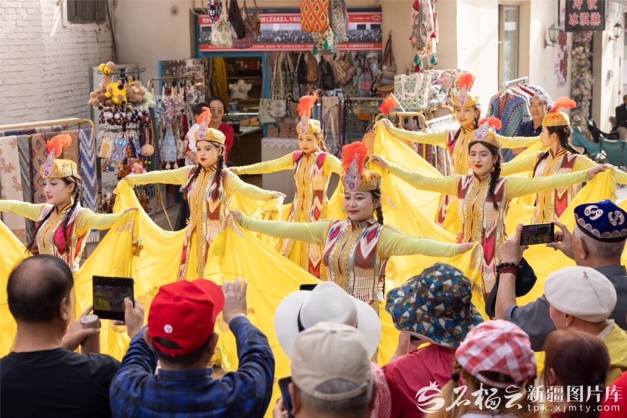 演员在龟兹小巷为游客表演歌舞。袁欢欢摄