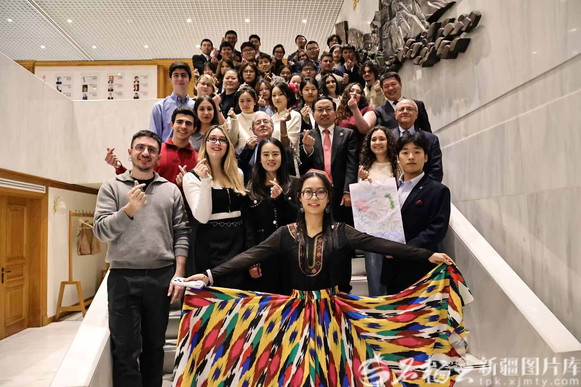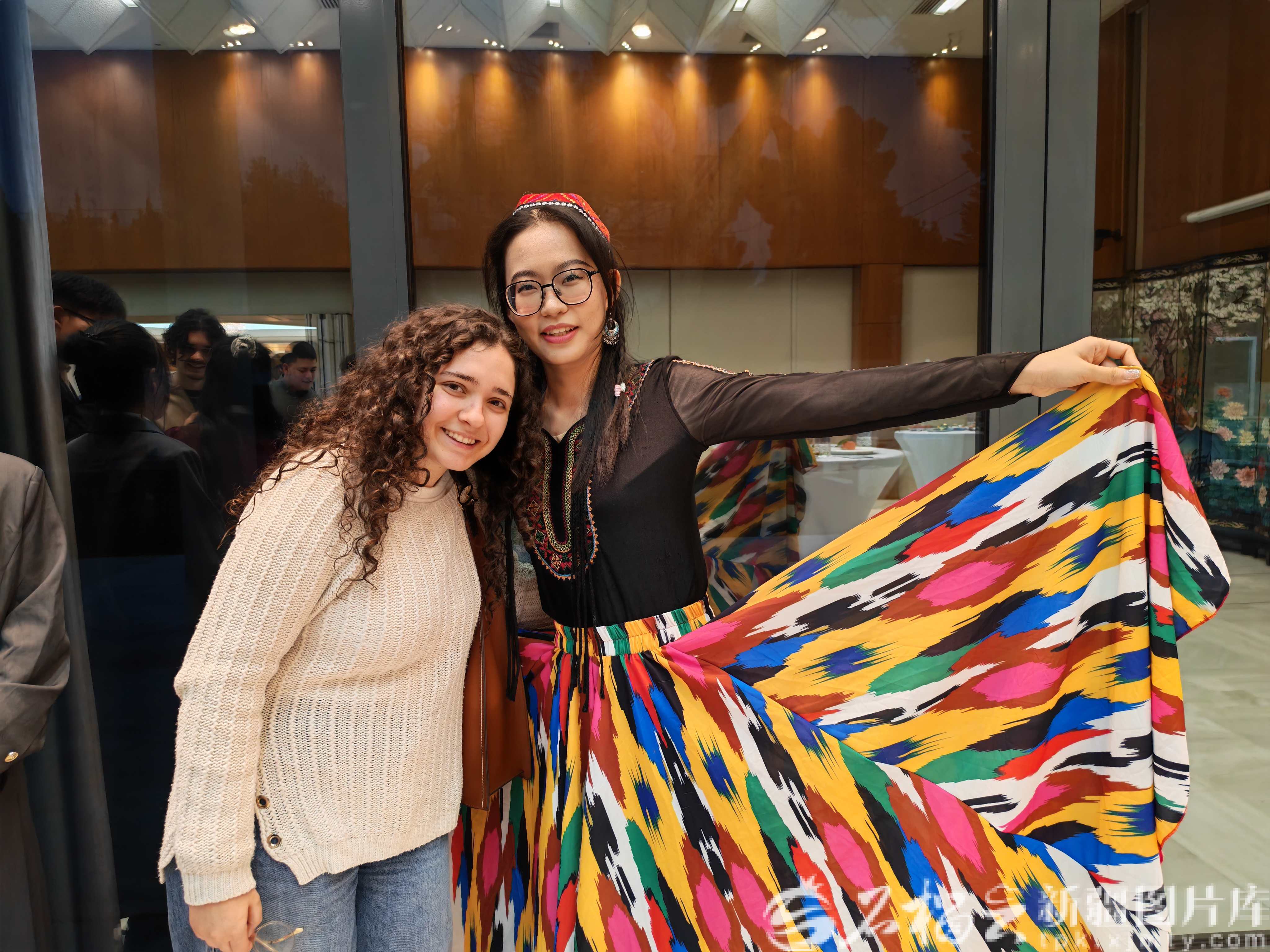 论坛现场,希腊青年米娜主动上前,好奇地询问服饰的工艺与寓意,梁炤媛用英语详细介绍了艾德莱斯绸的织造过程,讲述其中“石榴纹”所象征的民族团结寓意。“米娜说,她特别向往中国新疆,还说从服饰的纹样里,能感受到新疆人民对美好生活的向往。”梁炤媛说。