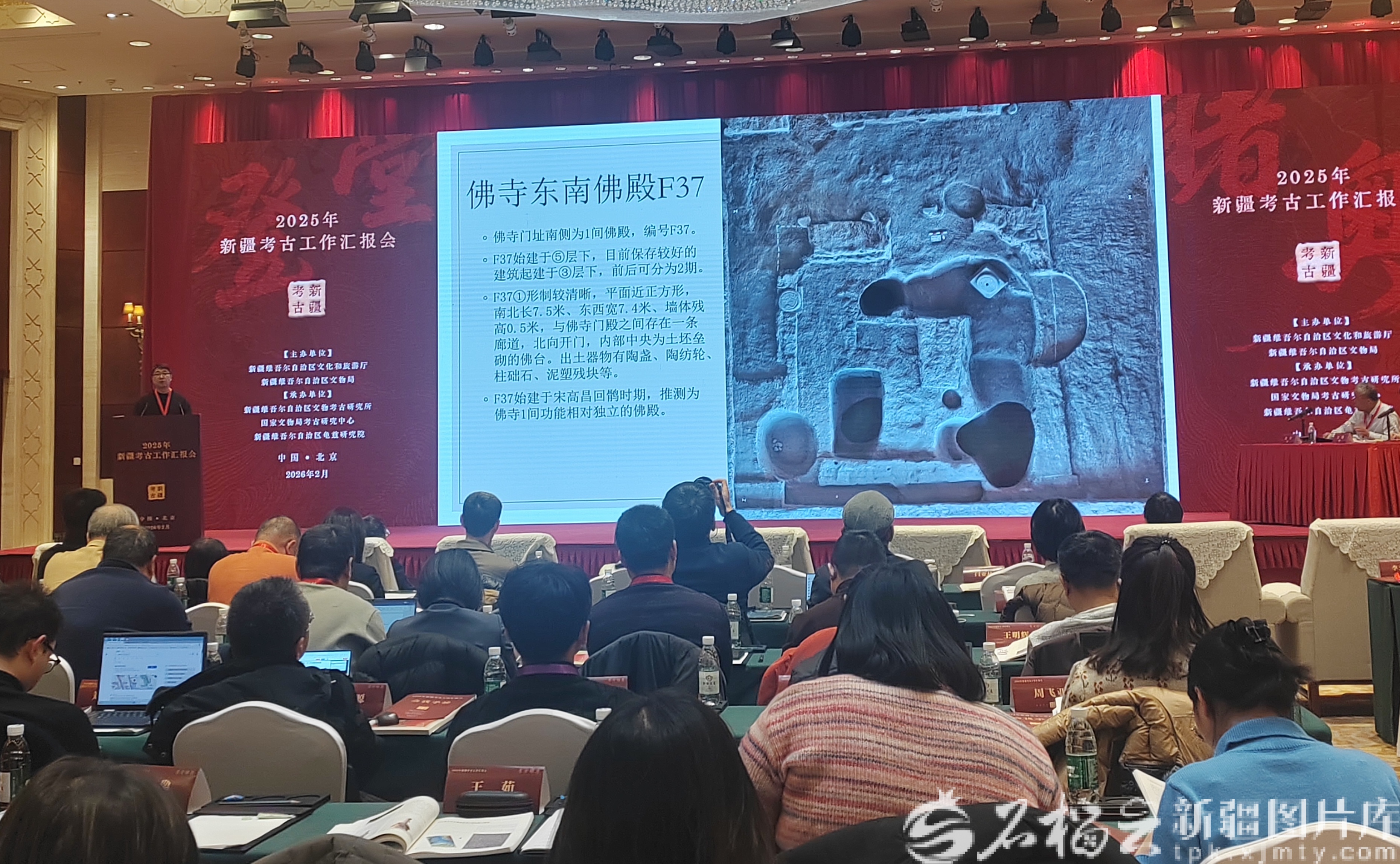 任冠在2025年新疆考古工作汇报会上,介绍过去一年唐朝墩古城遗址的考古成果。石榴云/新疆日报记者 贾春霞摄