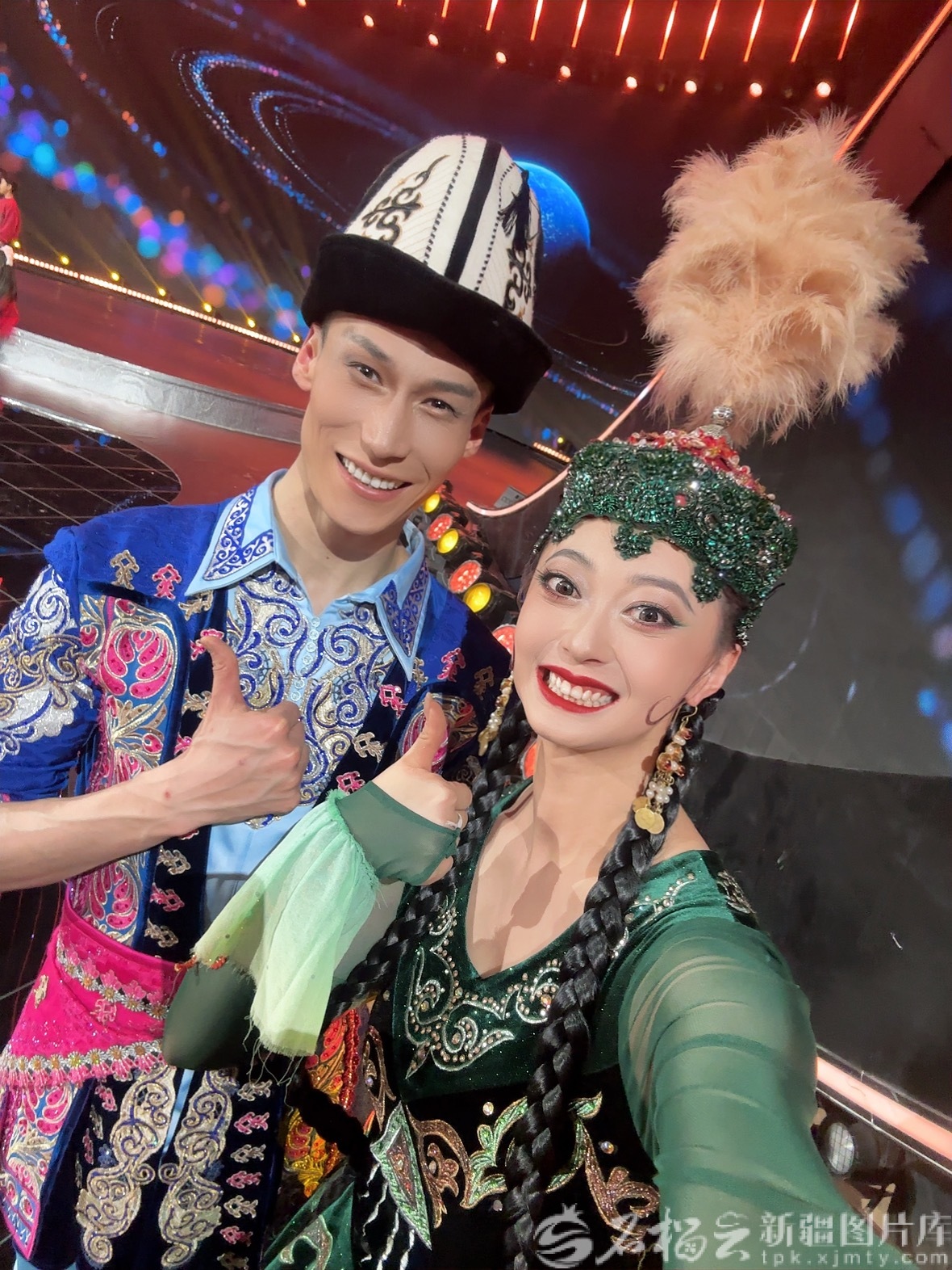 中国东方演艺集团舞蹈演员阿尔曼·艾尼瓦尔(左一)和中国歌剧舞剧院青年舞蹈家王雪柔(右一)一起参加了2026新疆国际春晚的表演。本人提供