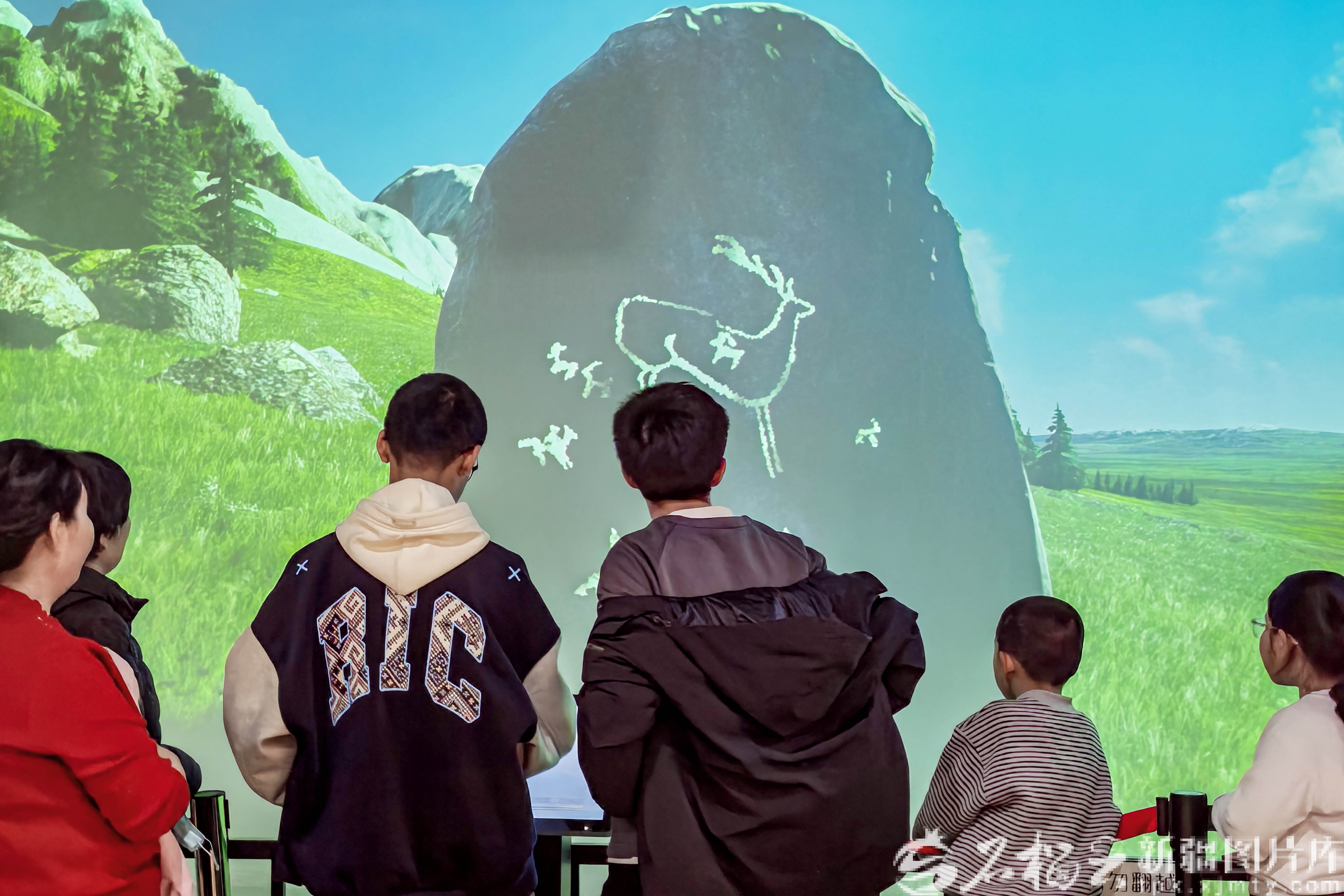 2月18日,游客在哈密市博物馆观看岩画专题片。