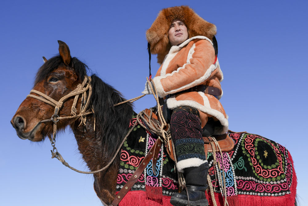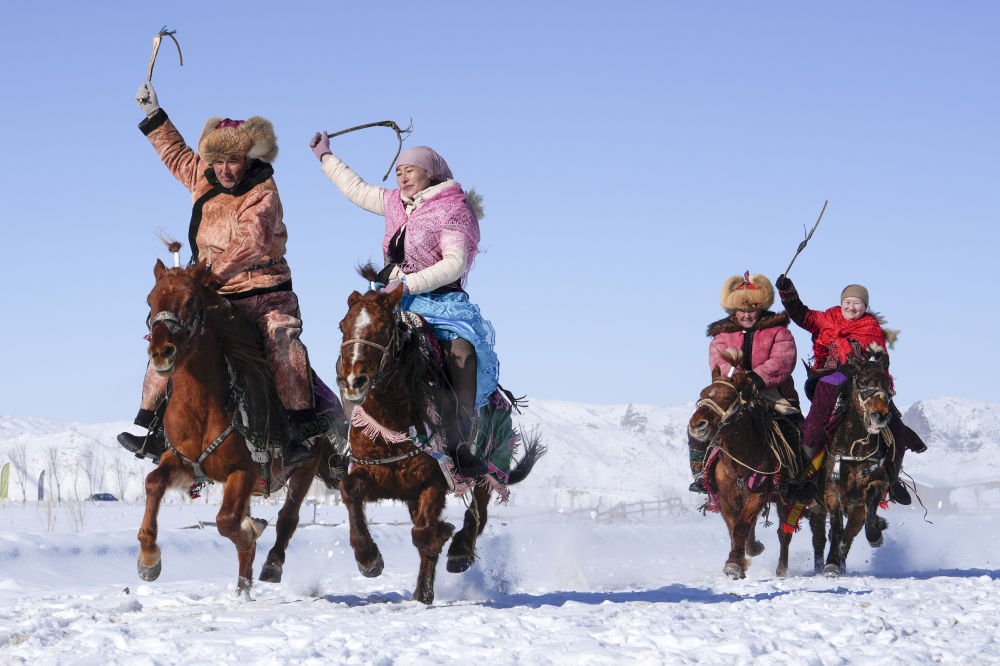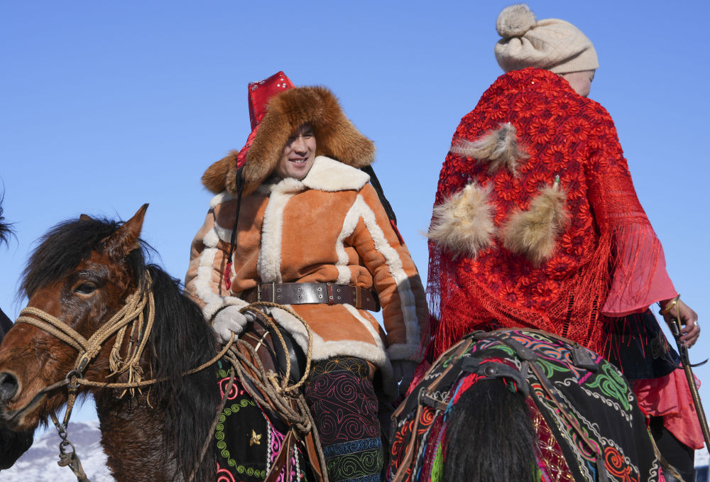 在新疆青河县狼山景区赛马场,当地群众身着盛装开展传统马上运动欢度新春佳节(2月17日摄)。新华社发(叶尔江·木哈买提 摄)